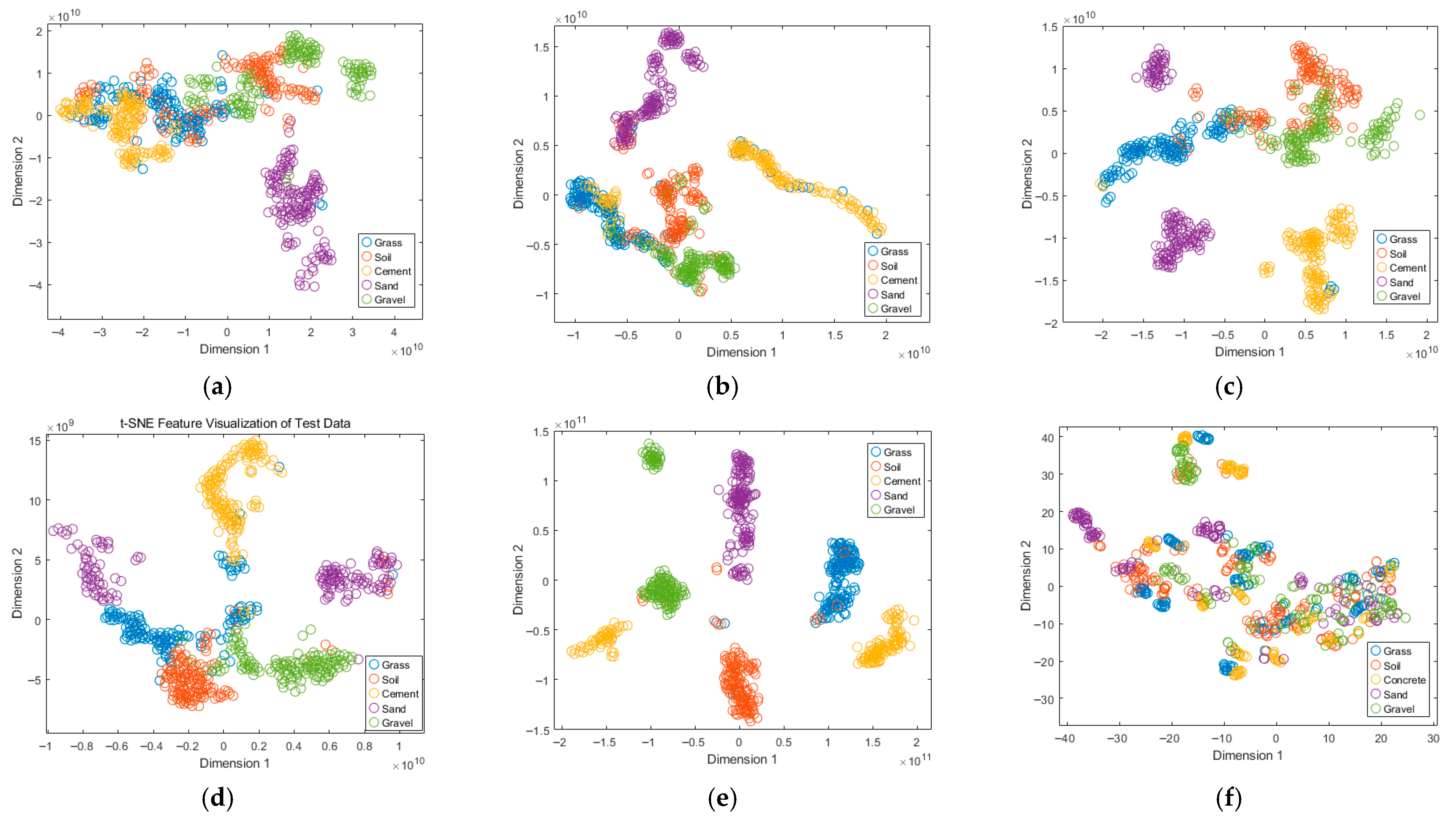 Table 4, different models exhibit substantially different clustering behaviors in the high-dimensional feature space. With the progressive enhancement of model architectures, the feature distribution evolves from dispersed and ambiguous clusters to more compact intra-class structures and clearer inter-class separation. Among all models, the proposed 1D-CNN-LSTM-CBAM-iBWOA achieves the most distinct clustering performance, where the five ground categories form well-defined clusters with almost no noticeable misclassification. Consistently, this model also delivers the best results across global evaluation metrics, with trustworthiness and continuity both equal to 1, a silhouette coefficient of 0.76192, and an intra-/inter-cluster distance ratio of 0.25814. These results confirm the effectiveness and robustness of the proposed model for ground type recognition tasks.