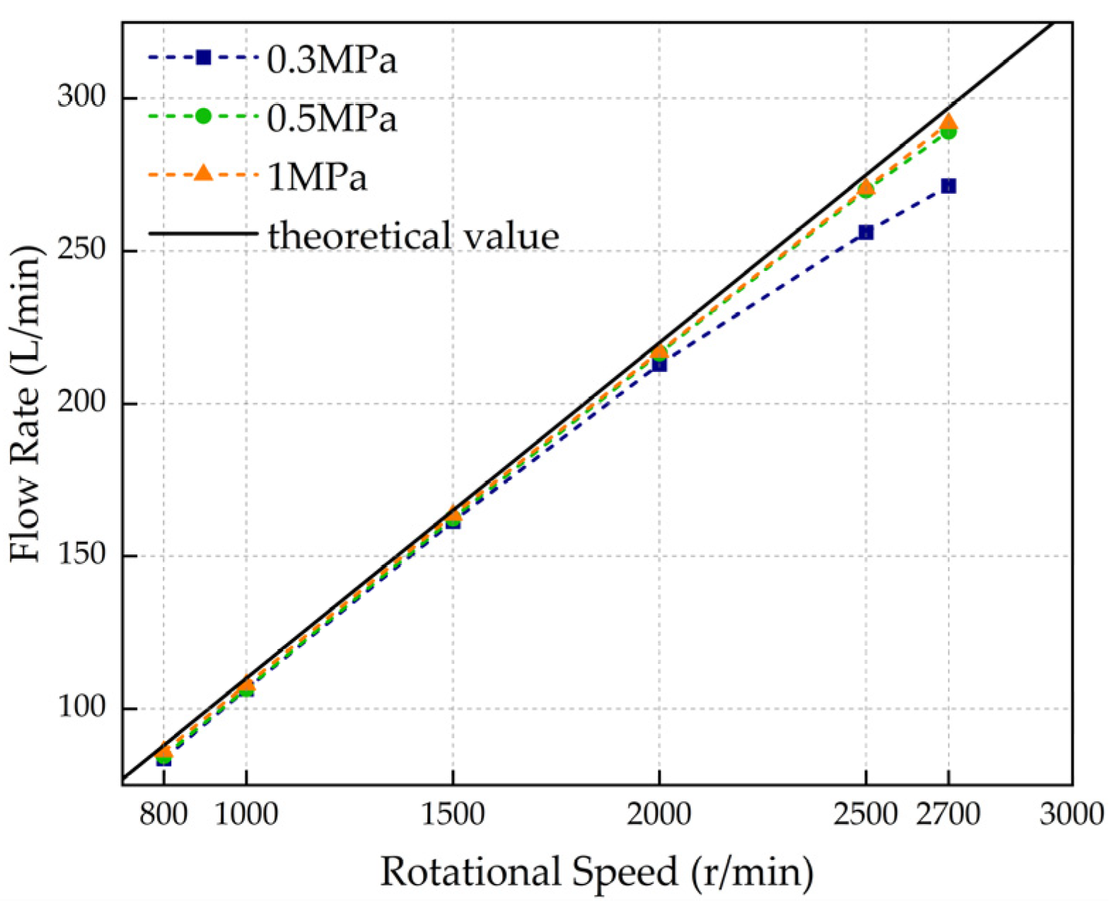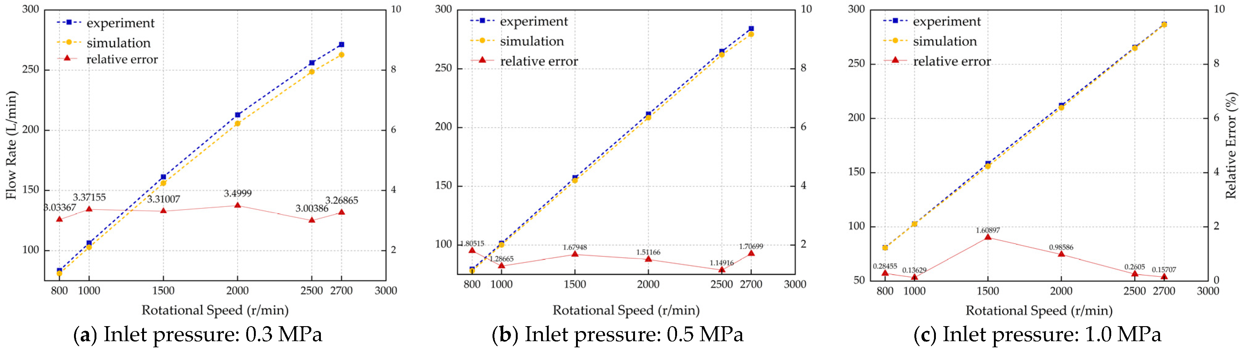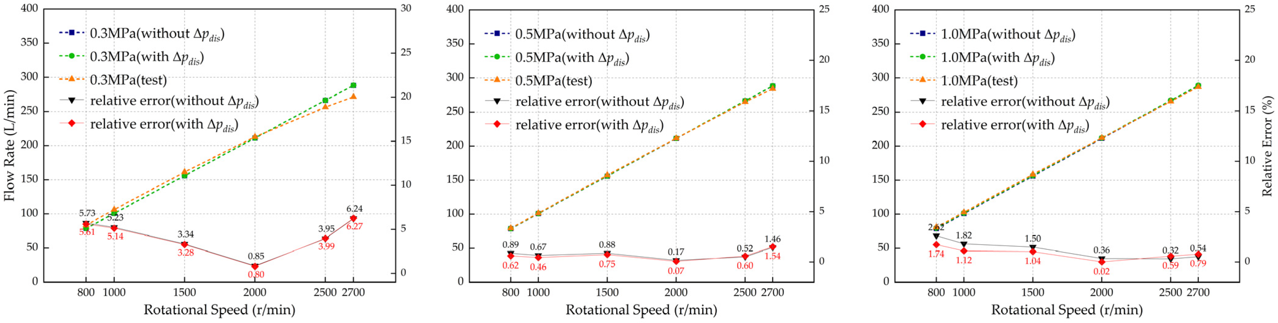 - A CFD simulation model based on the FCM is established, where the dynamic mesh technique enables effective coupling between piston chamber reciprocation and dynamic and static flow fields. A test rig is built for model verification; test results show the deviation between simulated and measured flow rates is ≤4%, confirming the model’s reliability. Meanwhile, complex flow passages are decomposed into typical units via segmented approximation, and a mathematical model of flow passage pressure loss is derived. By introducing a pressure loss correction term into the traditional flow rate model, under normal rotational speeds, specifically those ≤2000 rpm, the average flow rate prediction error is effectively reduced, improving the issue of neglected flow passage pressure loss in traditional models.