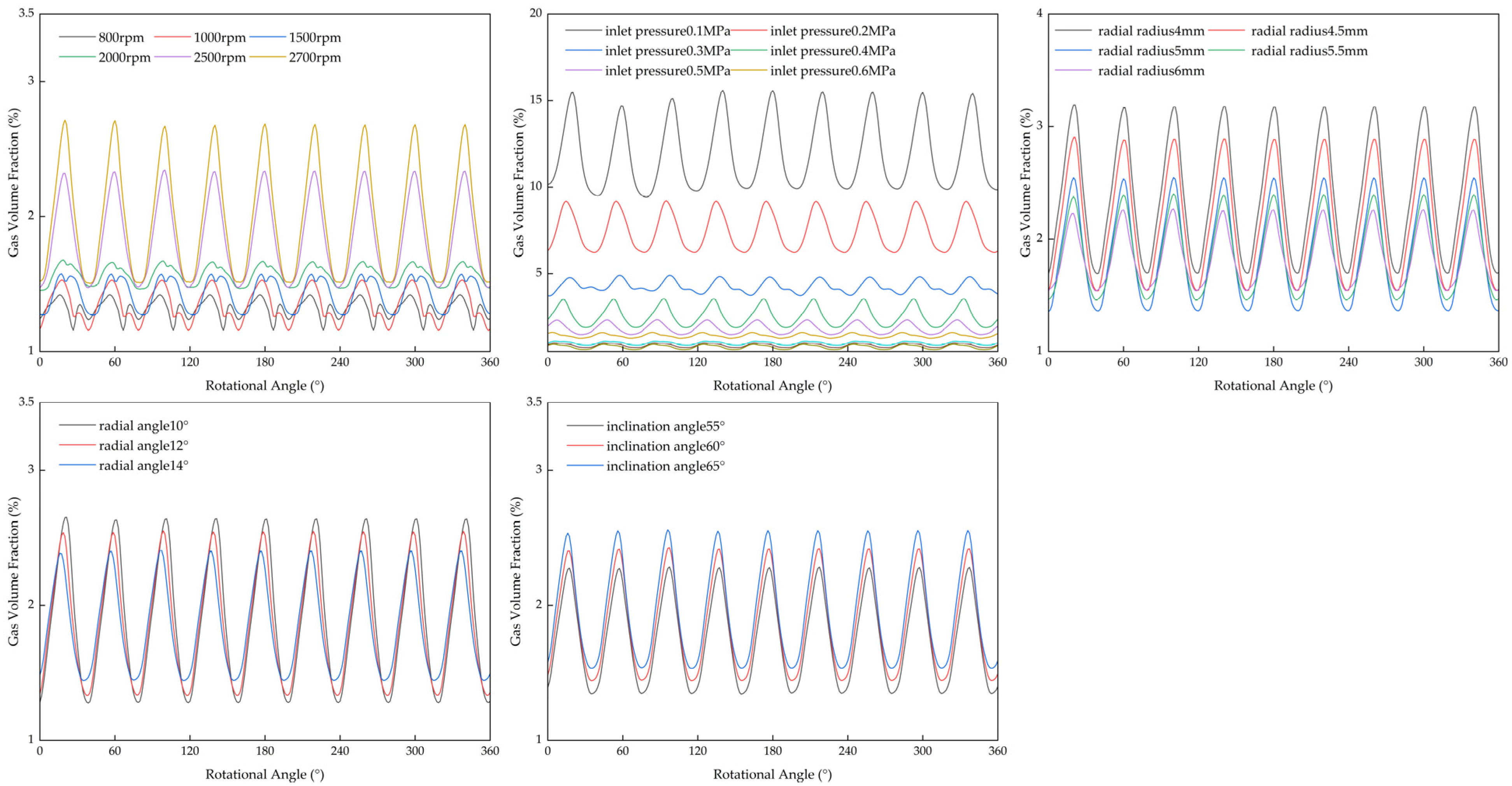 - Based on sensitivity analysis results, a hierarchical cavitation optimization strategy is proposed. For single parameter adjustment, inlet pressure should be prioritized with a recommended range of 0.5 to 1.0 MPa. For multi-parameter joint optimization, attention should be focused on matching inlet pressure with radial radius and rotational speed, where the radial radius has a recommended value of no less than 5.5 mm, to mitigate inter-parameter antagonistic effects. This strategy significantly reduces the gas volume fraction inside the pump under extreme operating conditions, such as 2700 rpm and 0.1 MPa, offering a reference for improving the pump’s cavitation resistance and volumetric efficiency.