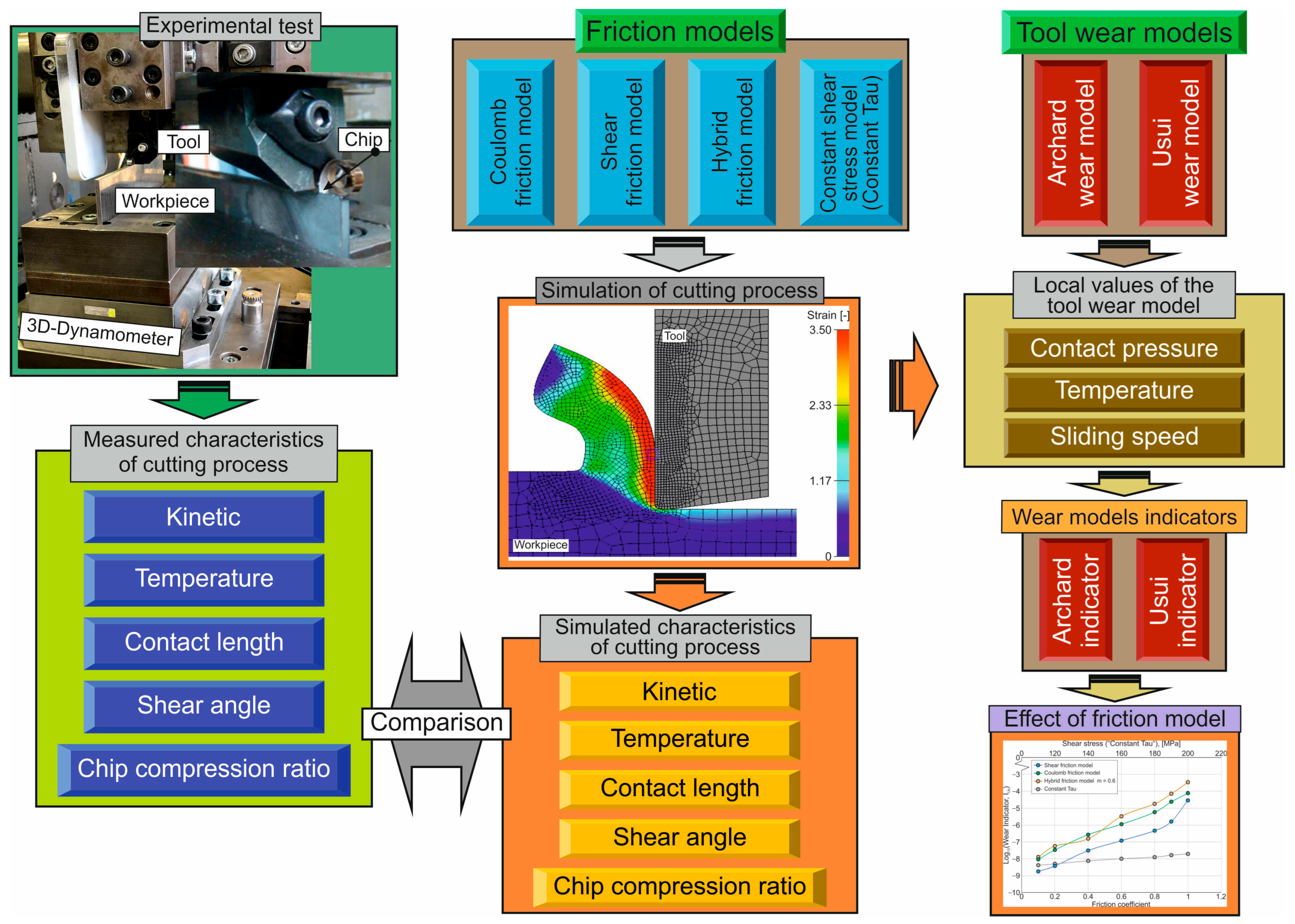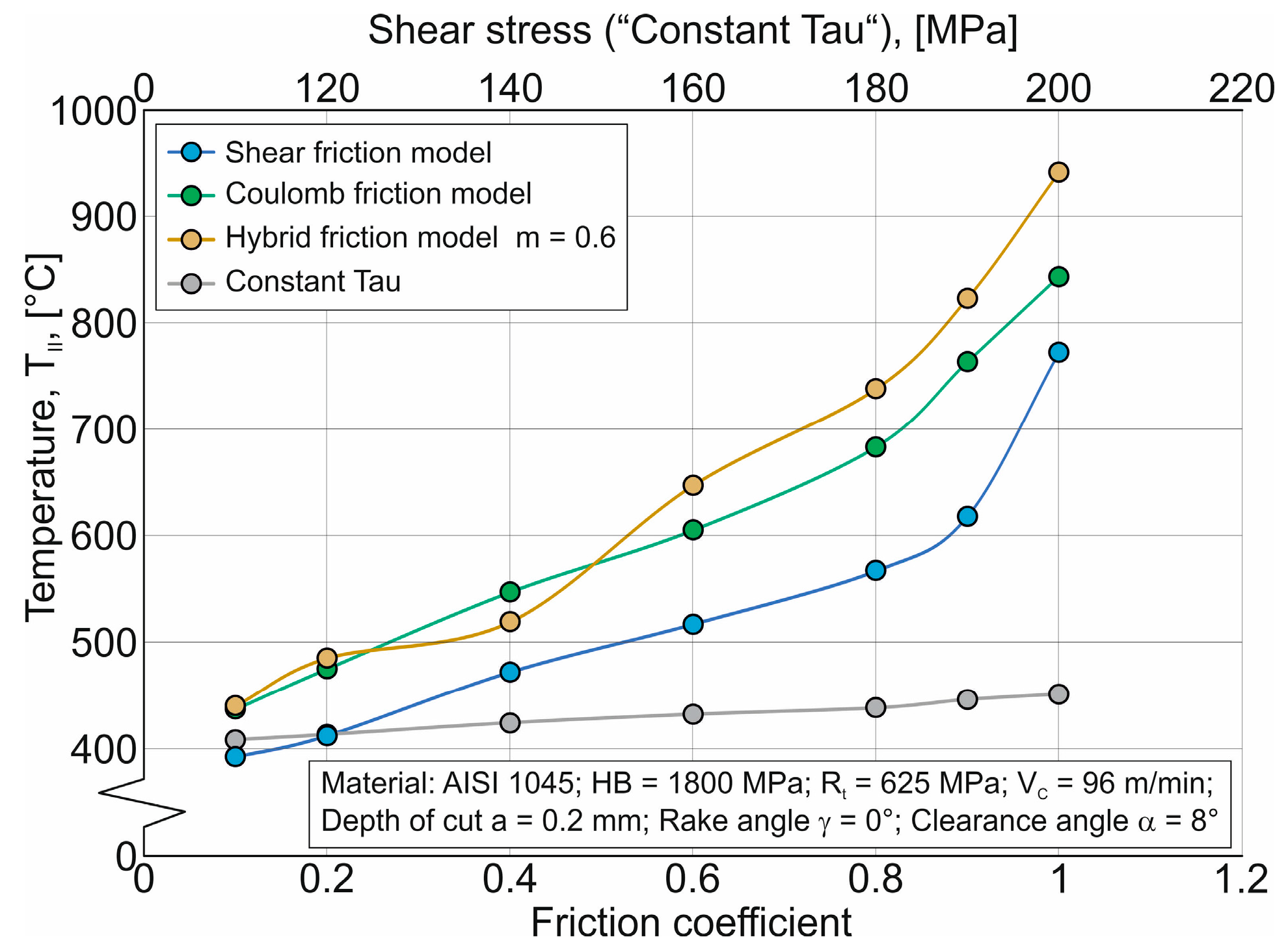 70]. The application of this model provides for changes in cutting characteristics in alignment with changes in friction parameters during the cutting process. In their study, Zhang et al. evaluated the behavior of such physical parameters of temperature-dependent friction models as contact pressure, relative sliding velocity, and temperature, as well as their influence on cutting process characteristics [