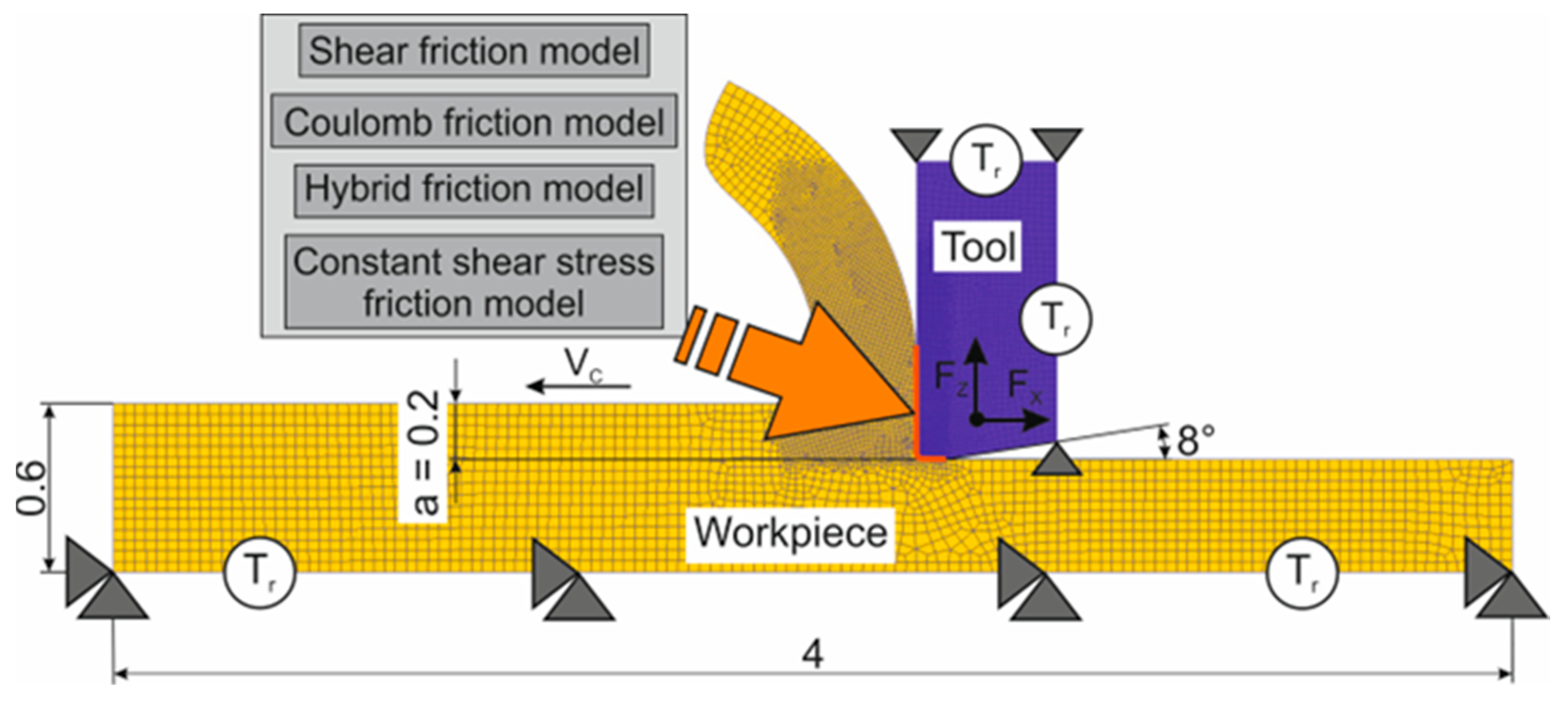 55]. A comparative study of various friction models: Zorev’s friction model, velocity-dependent friction model, and temperature-dependent friction model, performed by Yi et al., showed that the model choice significantly affects the predicted contact length, temperature distribution, and tool load. In particular, temperature-dependent models provide a much more realistic representation of thermal load compared to classical Coulomb models [