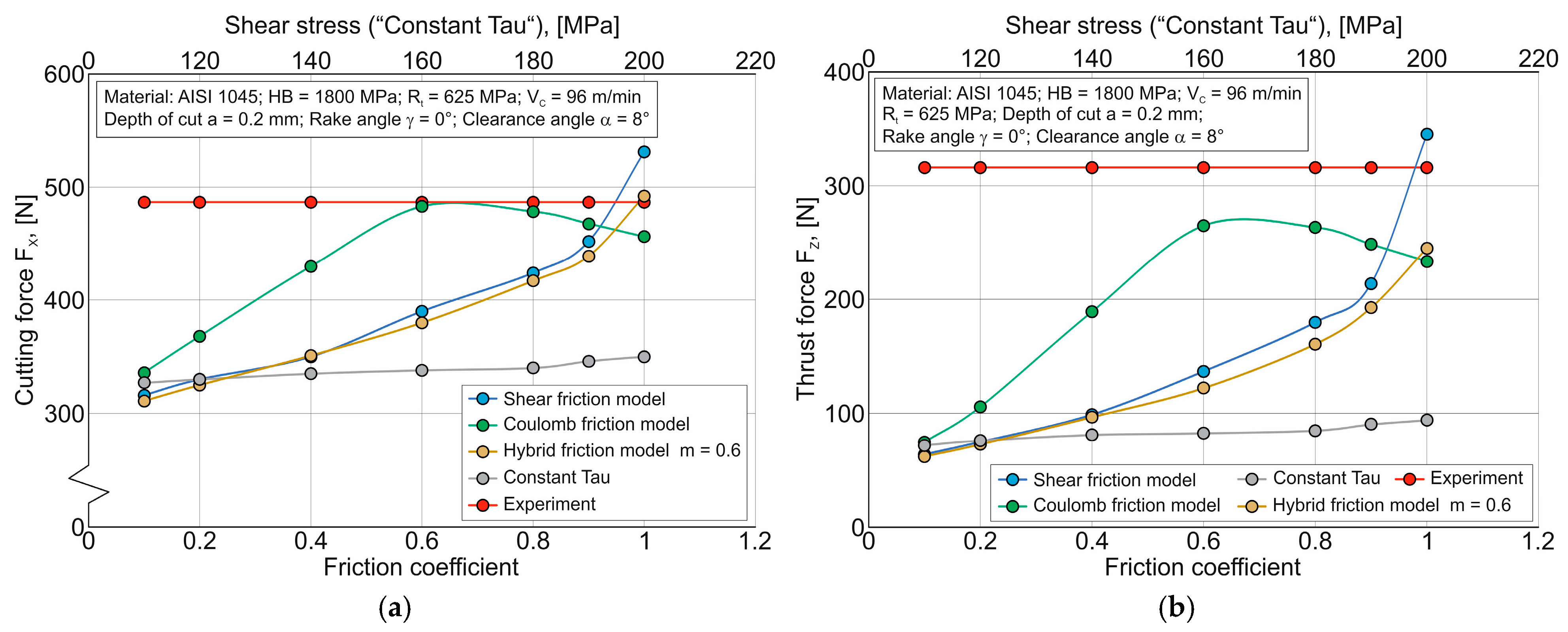 54]. In their review, Maranhão and Davim highlight the significance of friction parameters for simulation results, similar to the yield strength of the machined material. They point to an increase in contact length and plastic deformation zone with an increase in the friction coefficient, which leads to an increase in shear and normal forces and an increase in tool temperature [