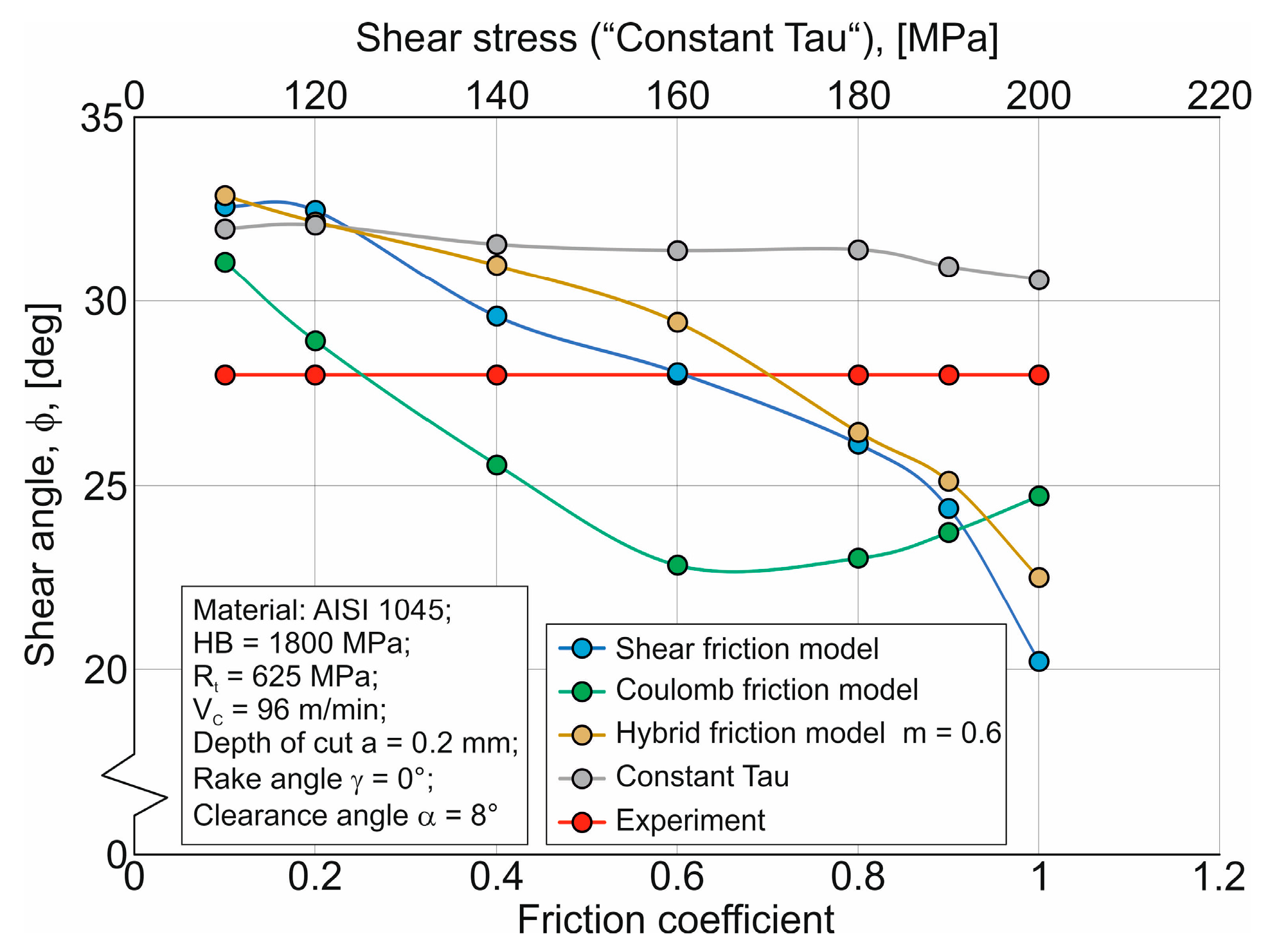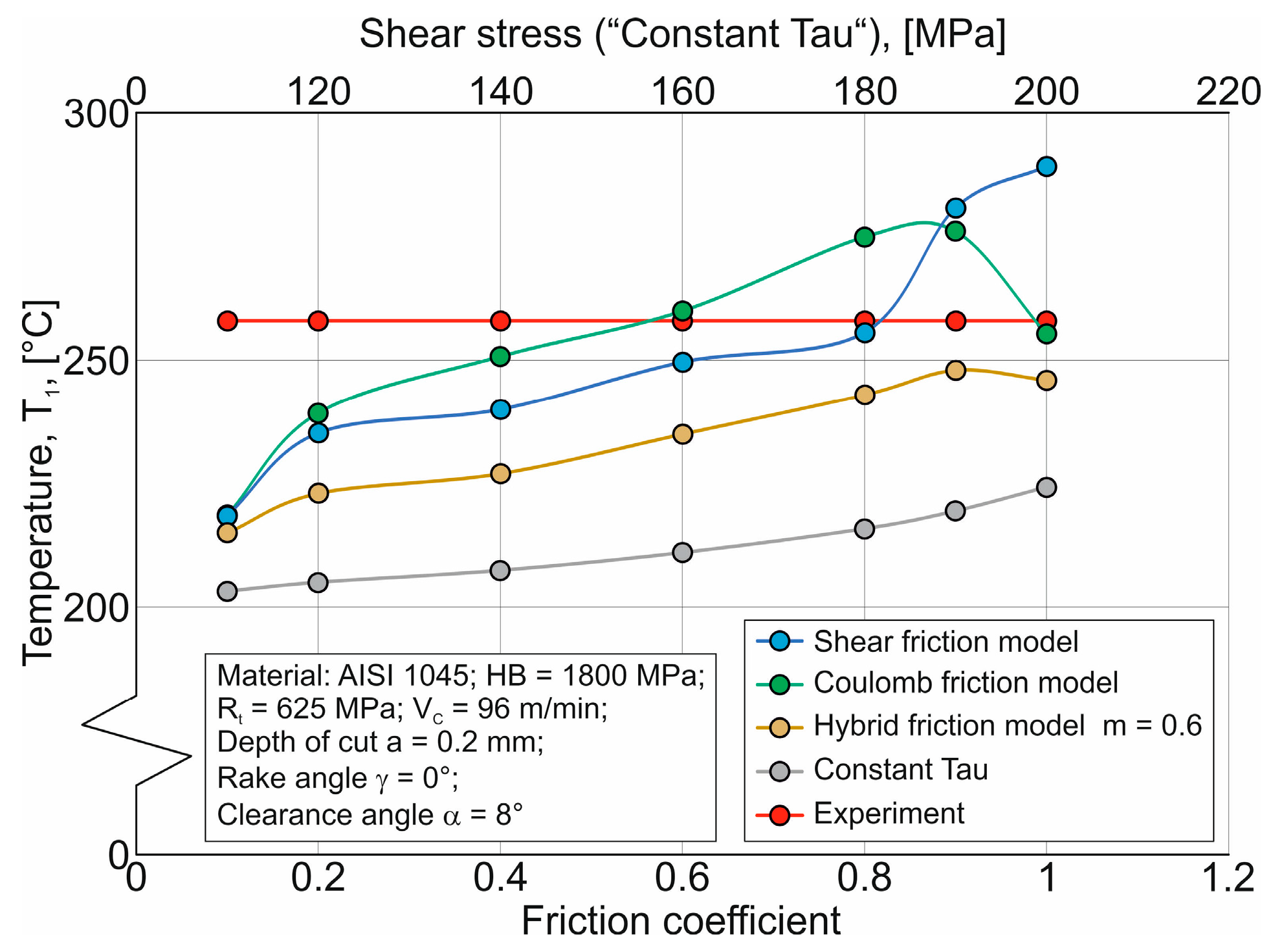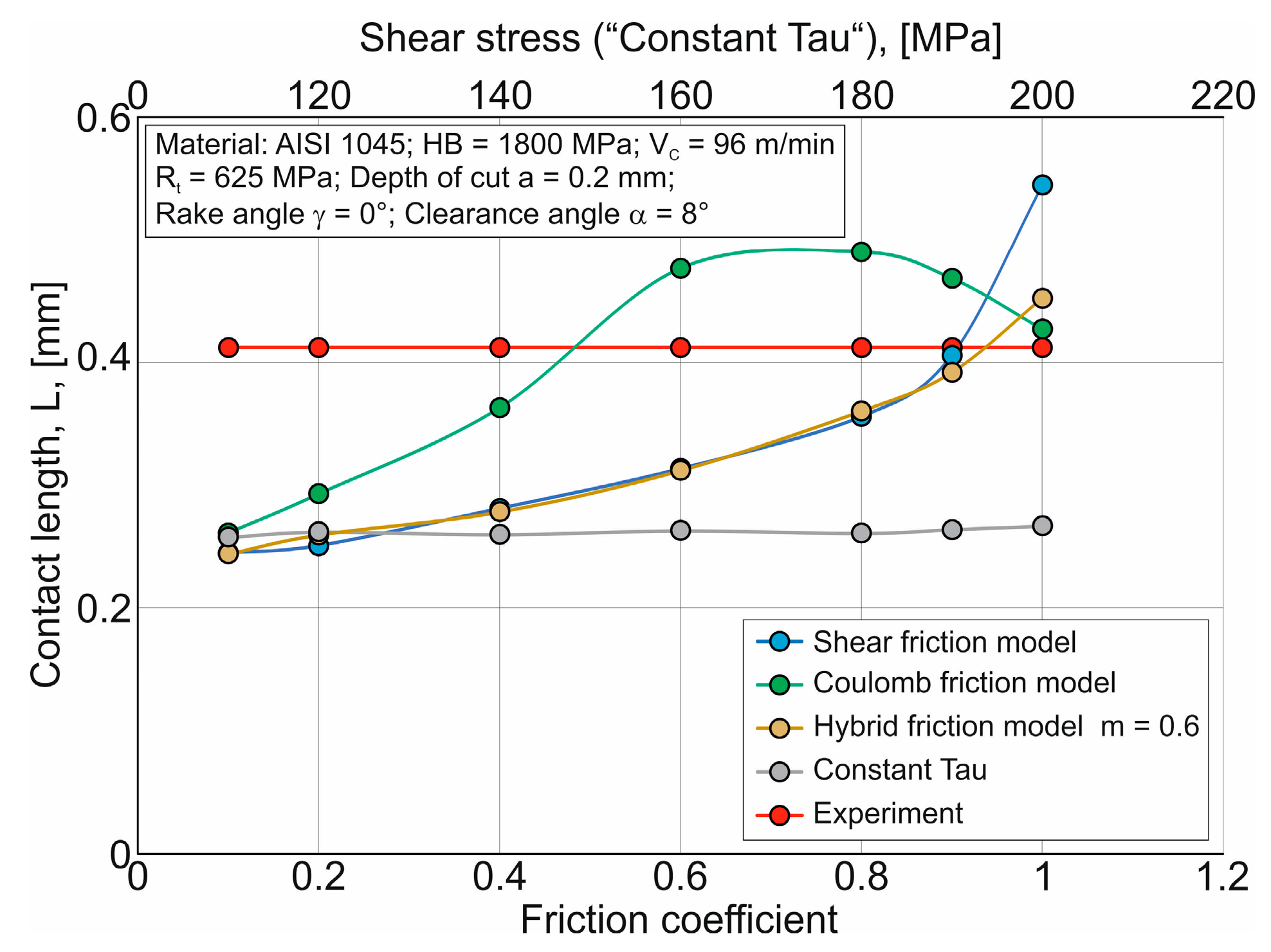 53]. By means of numerical simulations, Özel systematically investigated the influence of various friction models (Coulomb, shear friction, Zorev’s variable models) on the behavior of contact characteristics at the chip-tool interface. He quantitatively showed that normal and friction stresses, temperature, and tool wear depend significantly on the choice of friction model [
