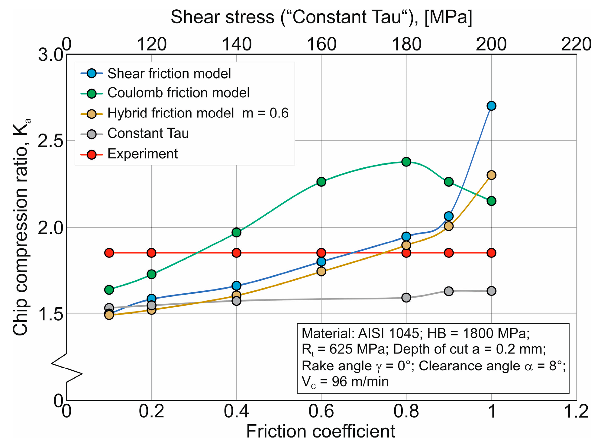 Ka for all shear stress values. Thus, in order to predict the chip compression ratio, in addition to the CTM friction model parameters, the material model parameters must also be determined, unlike the parameters used in the case for other friction models. It is quite possible that when simulating the cutting process of difficult-to-machine materials, in order to predict the value of