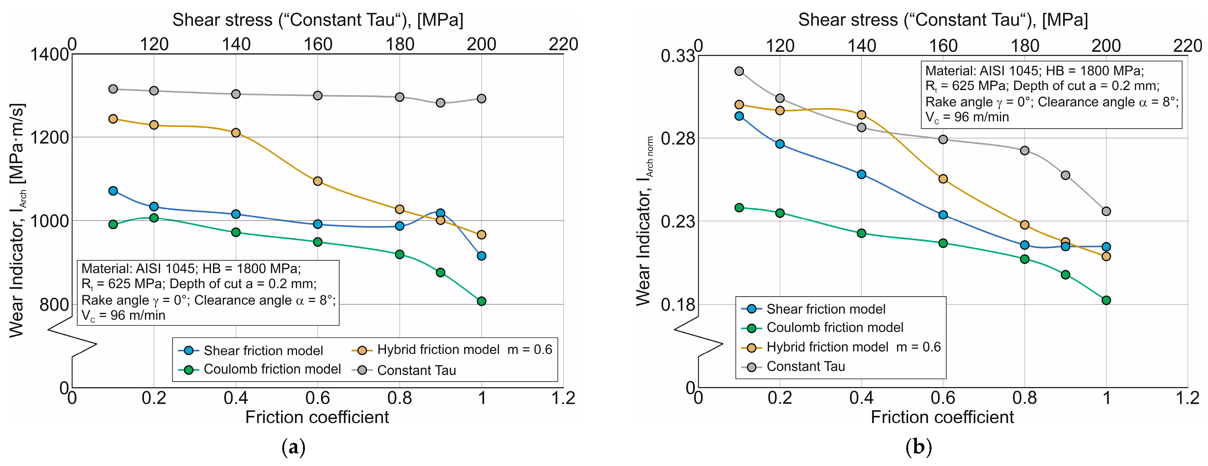 µ and shear stress at the contact between the tool cutting part and the machined material results in an increase in the predicted wear according to the Usui model. The degree of this increase is approximately the same for the SFM, HFM, and CFM friction models, with the highest predicted wear expected when using the HFM (see