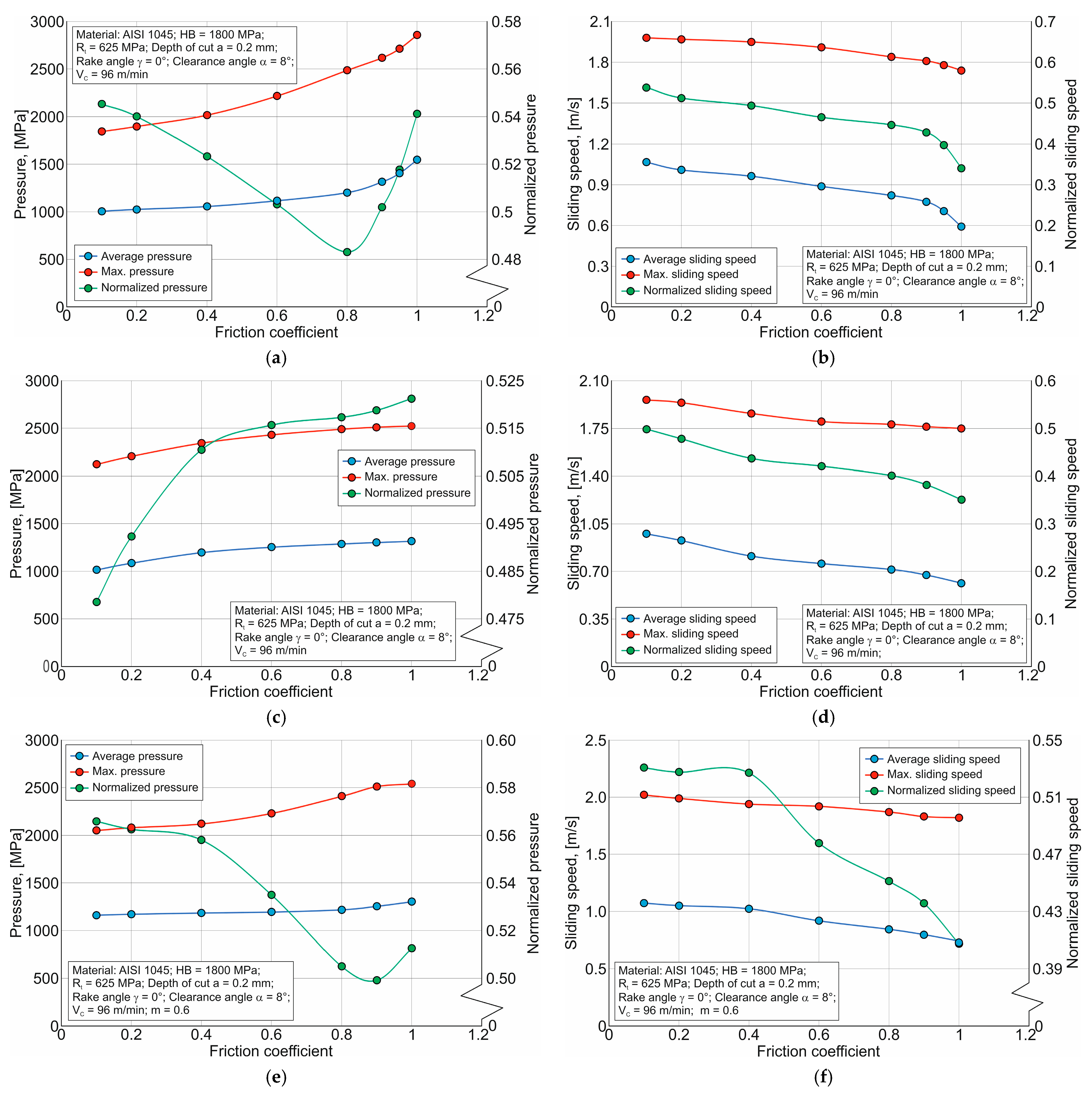 Figure 15a). Naturally, when using different friction models, the degree of this reduction also differs from one another (see above). At the same time, the nature of the change in normalized pressure values in contact between the tool and the machined material is unique for each considered friction model. When using the SFM, the normalized pressure value decreases monotonically as the friction coefficient