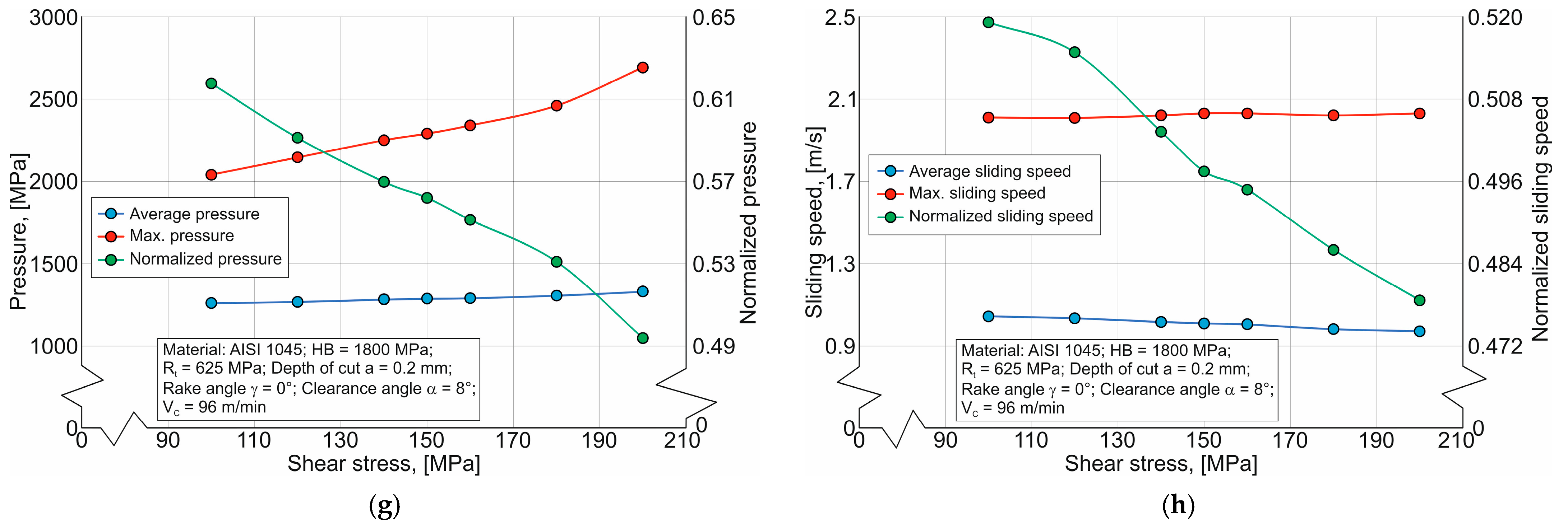 Figure 17f). Finally, when using the CTM friction model, both the normalized pressure value and the normalized relative displacement velocity decrease almost monotonically with increasing shear stress at the contact between the tool cutting part and the machined material (see