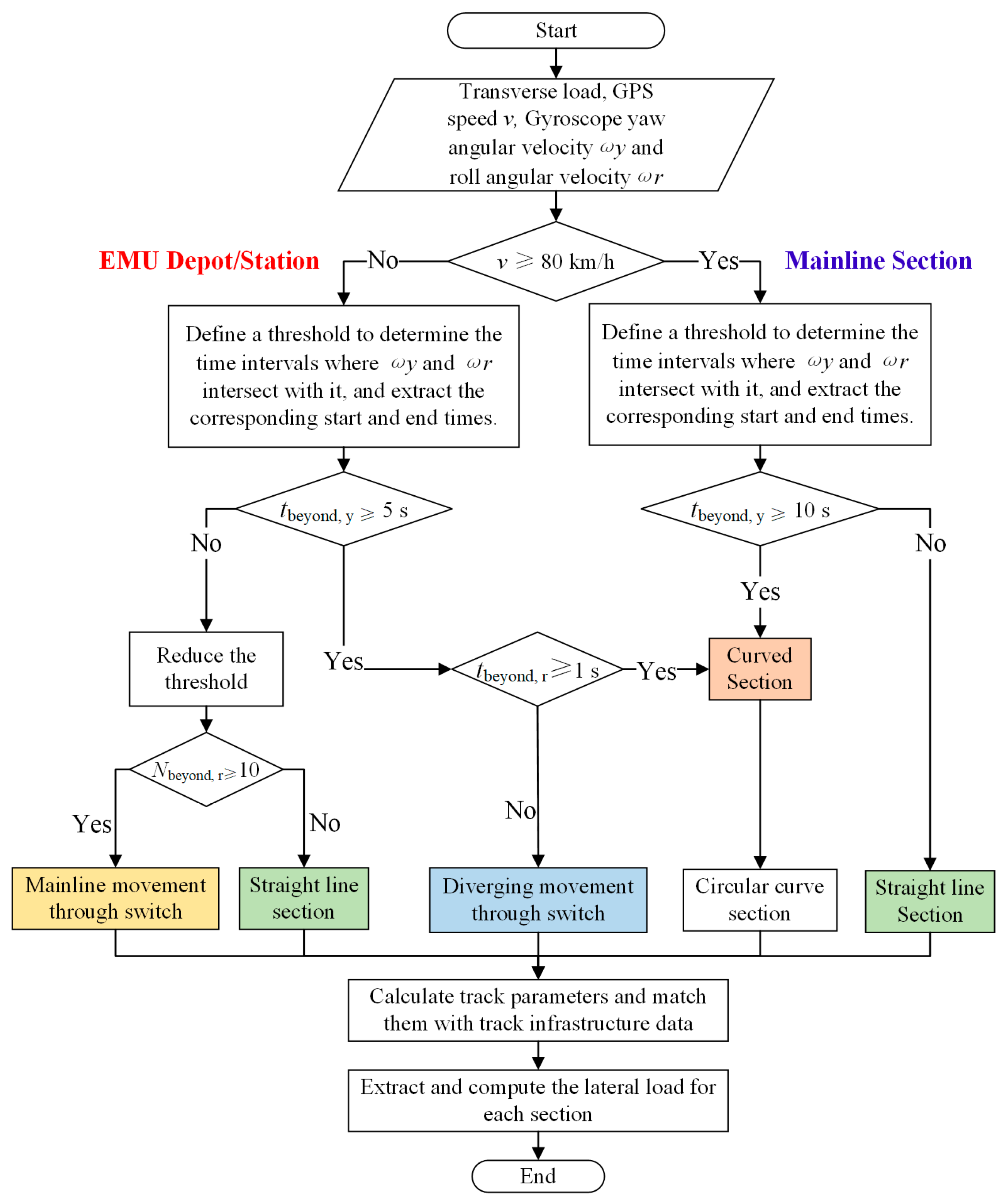 - A similar procedure is applied to the gyroscope signals within the station. The existence of a transition curve is determined based on tbeyond,y, and the durations for which the first and last roll angular velocity signal exceed the threshold within a curve-line section (tbeyond1,r and tbeyond2,r, respectively). This allows for distinguishing between a regular curve-line section and a diverging movement section. The start and end times of each curve-line section and diverging movement section, along with the total number of occurrences, are recorded accordingly;