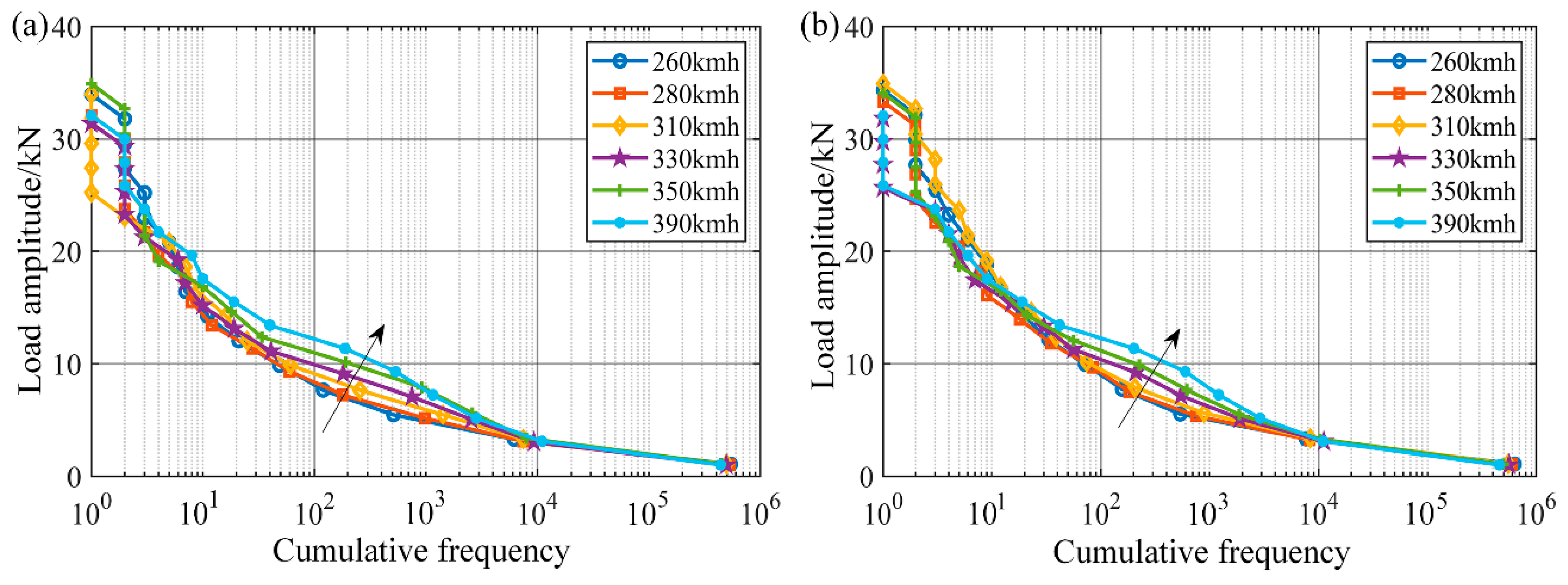 - Tao, G.; Liu, Z.; Ji, C.; Yang, G. Establishment and Analysis of Load Spectrum for Bogie Frame of High-Speed Train at 400 km/h Speed Level. Machines 2024, 12, 382. [Google Scholar] [CrossRef]