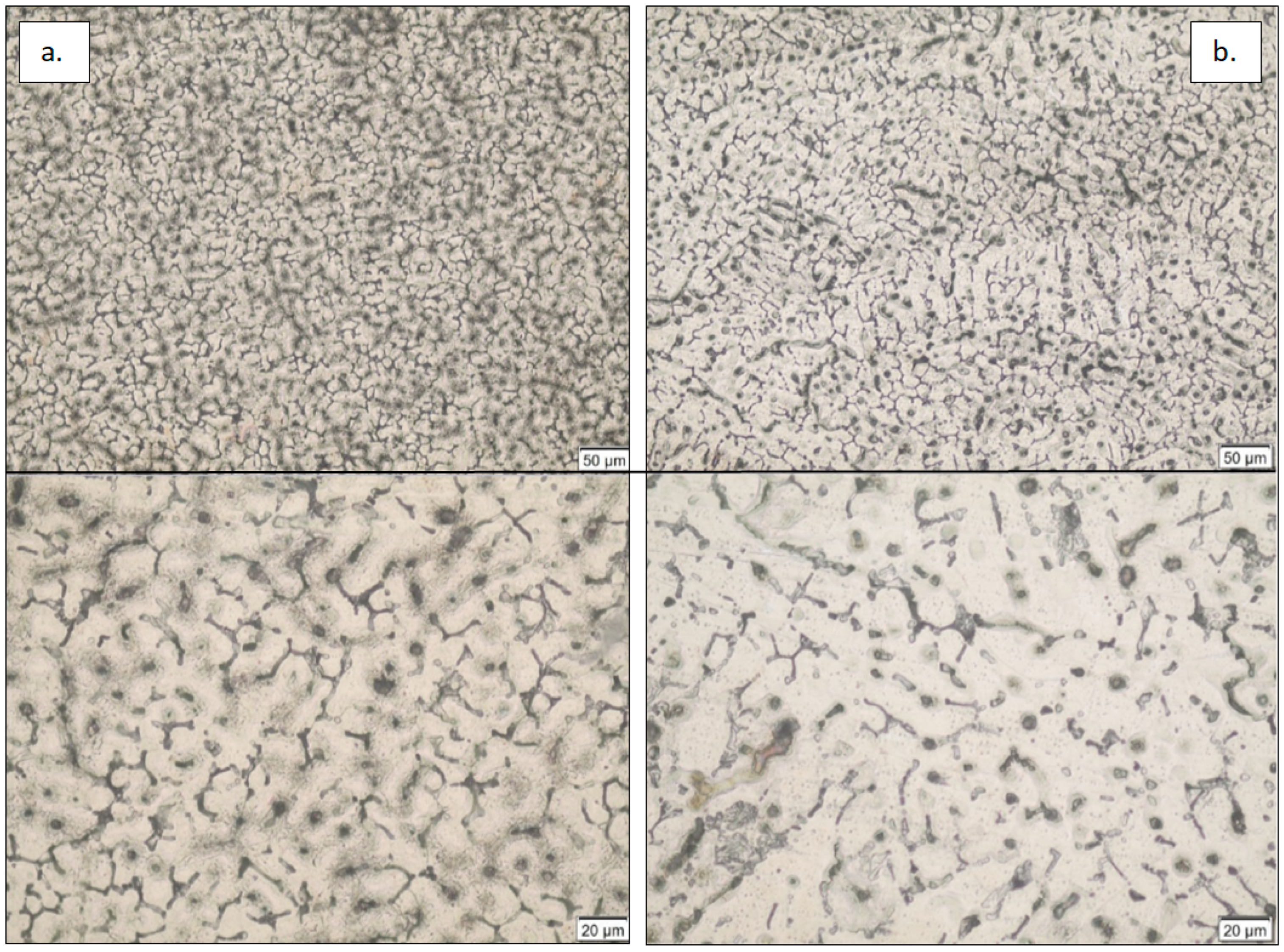 Figure 4, the contrast-enhanced and segmented regions clearly reveal the spatial distribution of intermetallic phases and their interaction with the matrix. This visual evidence supports the quantitative data obtained from image processing and confirms the influence of Fe and Cu additions on microstructural refinement.