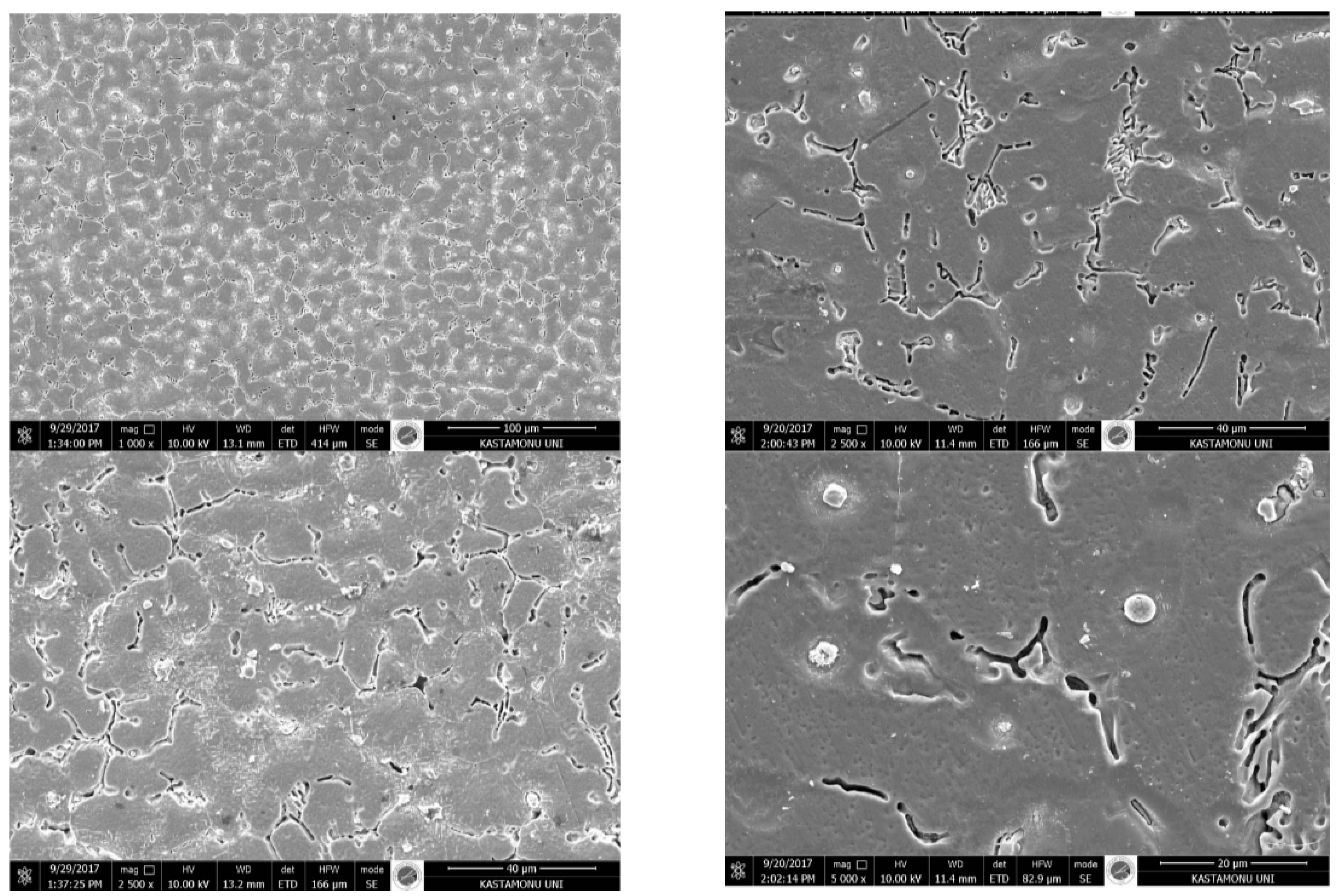 When examining the SEM images of Sample 2, the grains appear distinct, and the phase boundaries are clearly visible. A dense accumulation of intermetallic phases is observed along the phase boundaries, increasing the heterogeneity of the microstructure and creating localized variations. The grains exhibit an inhomogeneous distribution, with smaller grains being more prevalent. Dendritic structures are notably thick and more concentrated at the intersection points of the phase boundaries. The average grain diameter has decreased due to the high iron content. The accumulation at phase boundaries is clearly noticeable. This density indicates that while the material’s hardness and strength may increase, its ductility could be reduced.