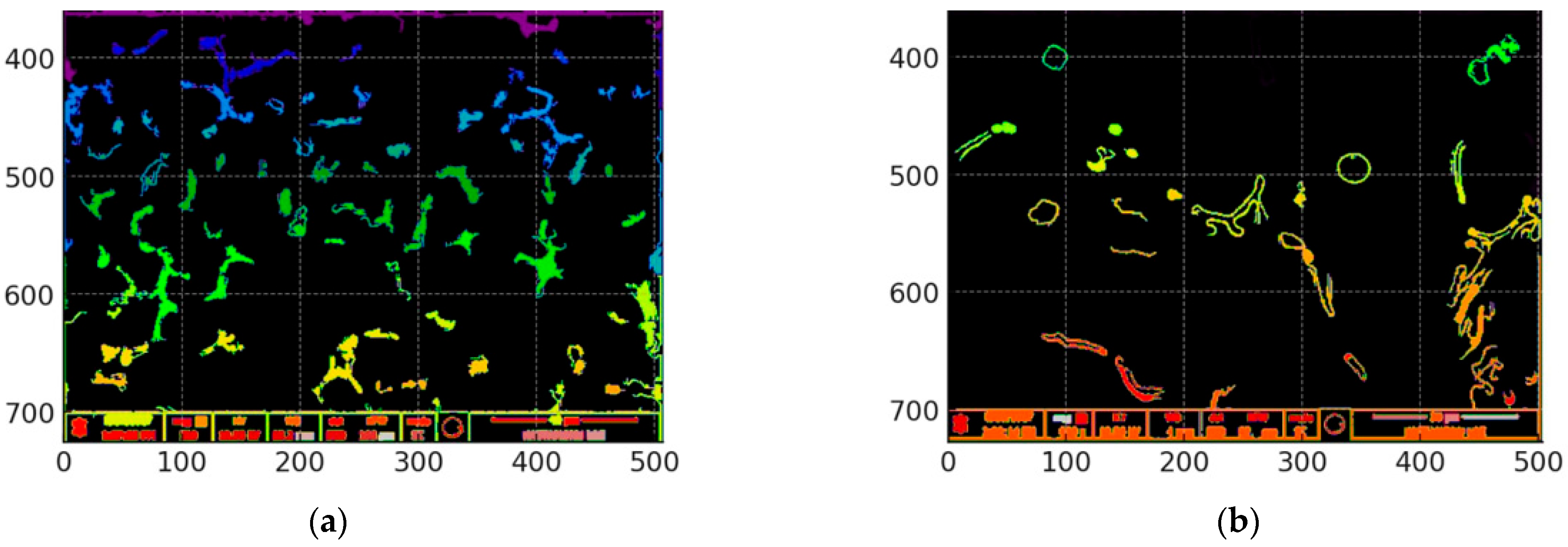 A 50-micron scale bar was used as a reference in each sample. The width of this scale bar was measured in pixels, determined to be 34 pixels. This measurement was verified using an image processing algorithm that incorporated contour detection and bounding box methods. Based on this, 1 pixel was calculated to be approximately 1.47 microns. This scaling factor was applied to convert all detected regions from pixels to microns. For example, the area measured in pixels was multiplied by 1.472 to express it in square microns. This approach is critical for ensuring the accuracy of visual data and aligning it with physical measurements.