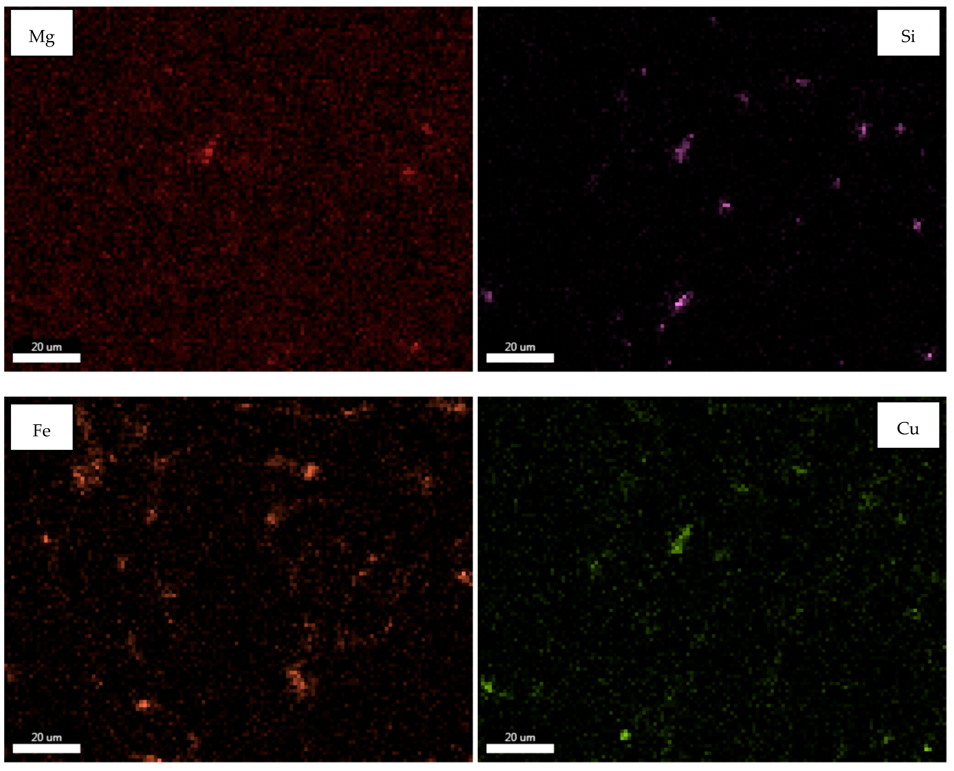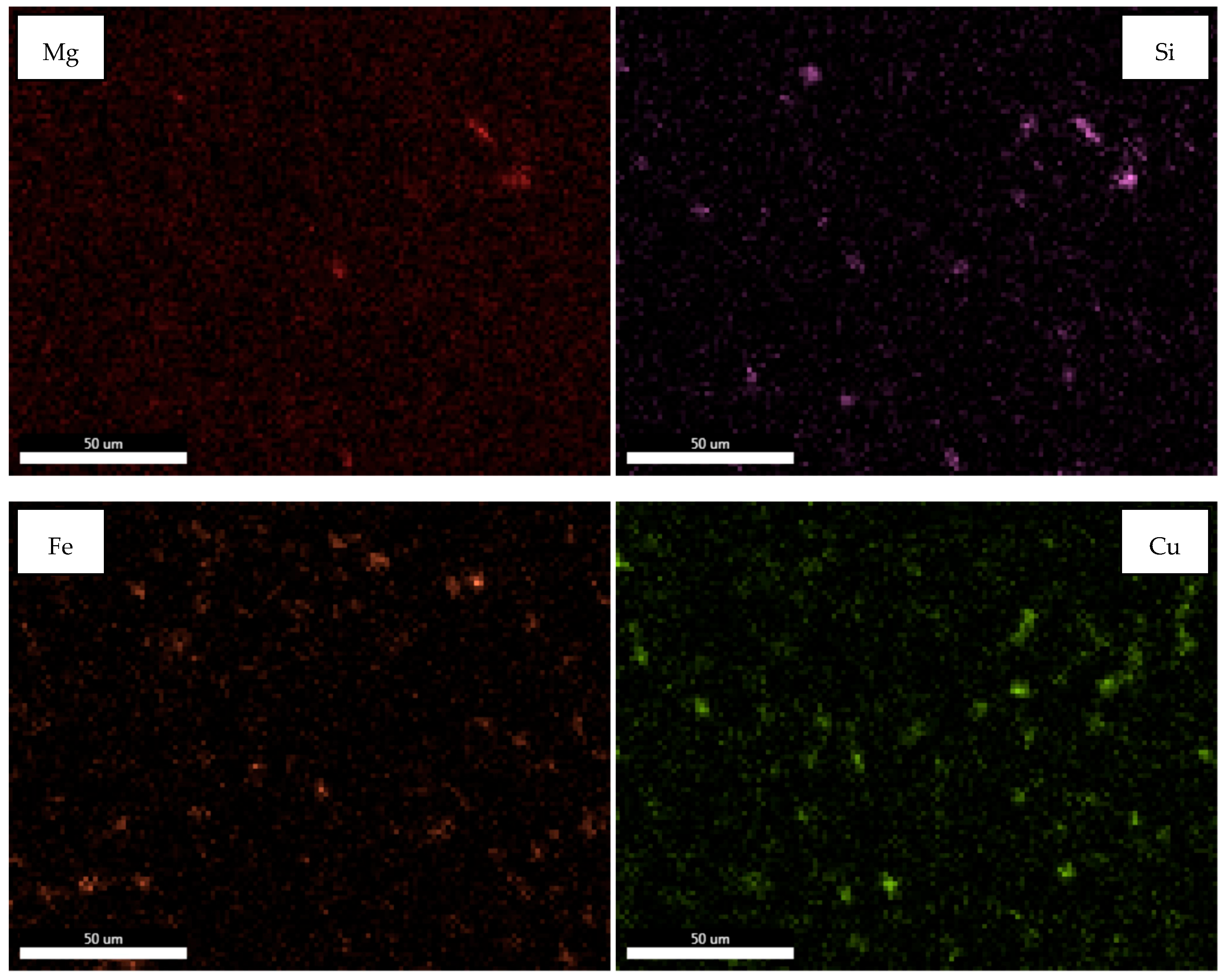 Furthermore, the distribution of intermetallic phases within the microstructure plays a critical role in determining the overall mechanical behavior. A uniform phase distribution minimizes stress concentrations, reducing the likelihood of brittle fracture. The fine and homogeneous dispersion of intermetallic phases in Sample 2 confirms that the material exhibits both high strength and moderate toughness, making it suitable for industrial applications requiring a balance between mechanical durability and processability. By correlating microstructural observations with experimental mechanical properties, a clear relationship between phase distribution, grain size, and mechanical performance can be established. The Fe and Cu contents directly influence the formation of secondary phases, which contribute to the material’s overall hardness and wear resistance.
