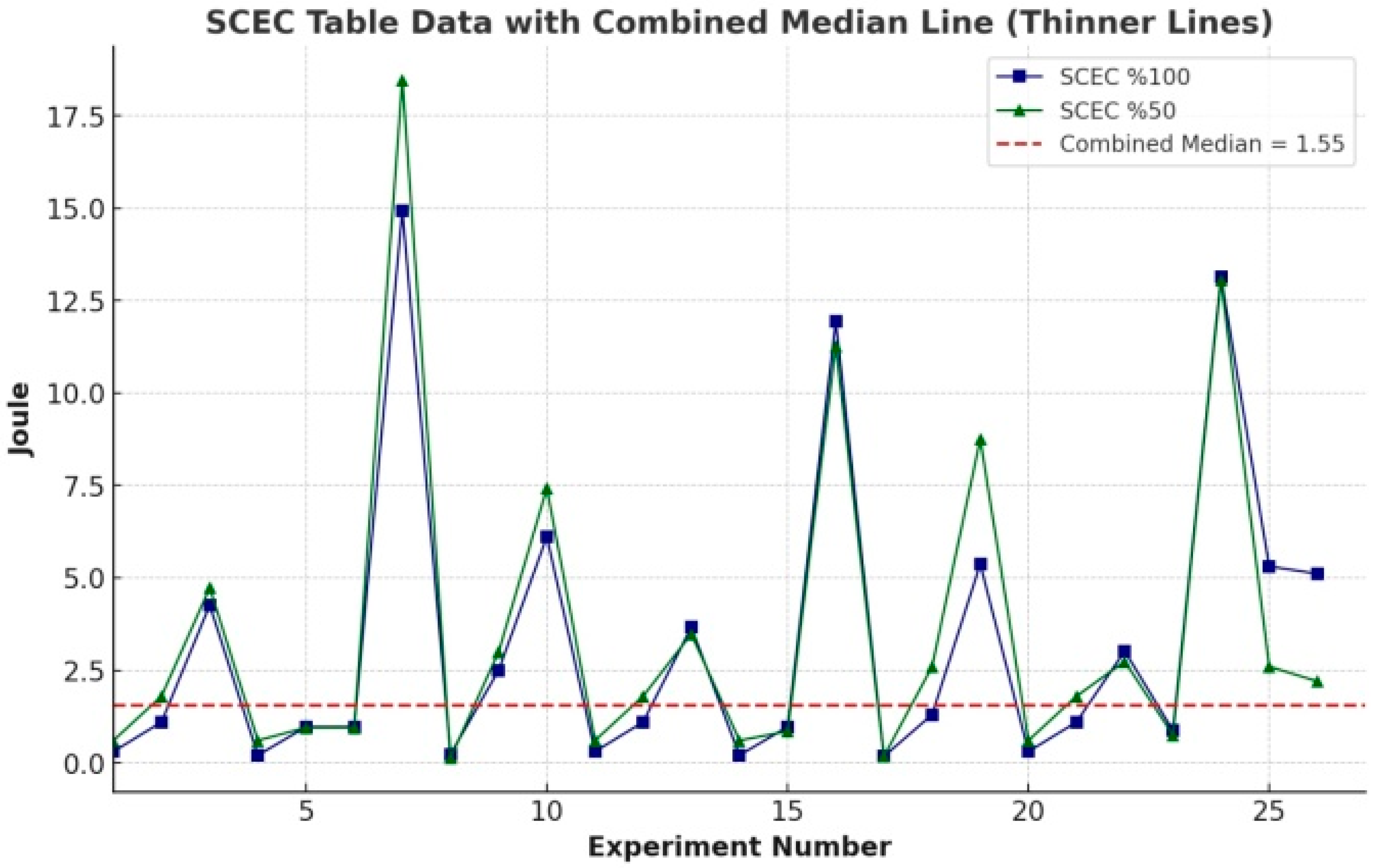 The analysis of SCEC values reveals that higher cutting speeds optimize energy consumption, whereas at lower feed rates, energy density tends to increase. Specifically, at a cutting speed of 150 m/s and a feed rate of 0.15 mm/s, the SCEC 100% and SCEC 50% values exhibit a more balanced distribution. These findings suggest that to enhance energy efficiency, a high cutting speed and a moderate feed rate should be preferred. When evaluating the impact of material type, the results indicate that energy consumption is directly related to the physical properties of the material. Among the tested materials, Material 2 demonstrated the lowest SEC and SCEC values, providing a significant advantage in terms of energy efficiency. In contrast, Materials 1 and 3 resulted in higher energy consumption, emphasizing the need for careful material selection to optimize machining efficiency.
