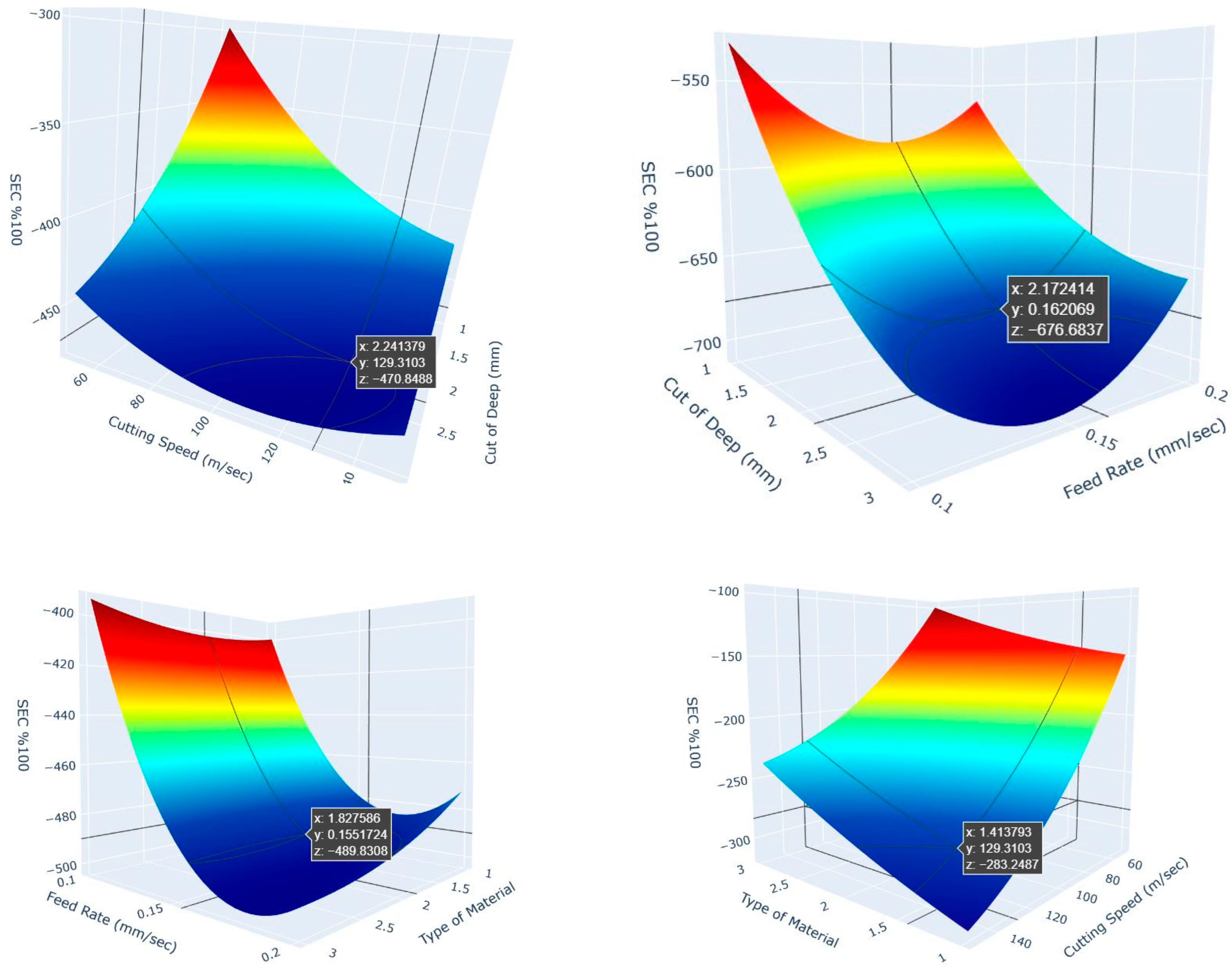 The best results are achieved when the cutting depth is between 2.5–3 mm and the feed rate is within the range of 0.12–0.15 mm/s. Extremely low or high feed rates can increase energy consumption, thereby raising operational costs. Therefore, machining parameters must be carefully optimized. The graph depicting the influence of material type and feed rate on energy consumption reveals that material type has a strong impact on SEC. Type 1 material stands out with low energy consumption, whereas Type 3 material significantly increases SEC values. This disparity arises from differences in material hardness and machinability. Regarding feed rate, SEC values remain low within the 0.12–0.15 mm/s range; exceeding this range leads to an increase in energy consumption.