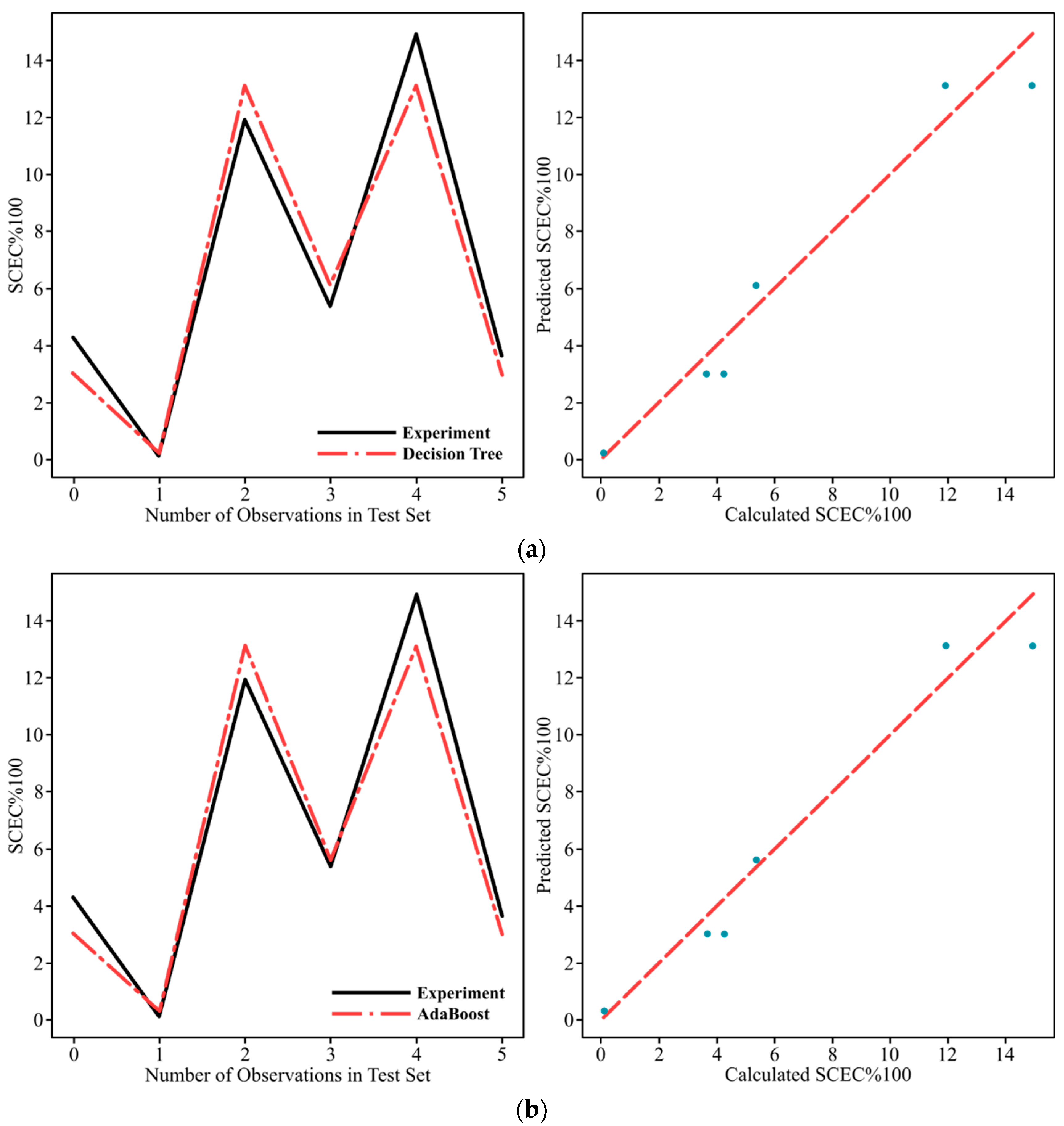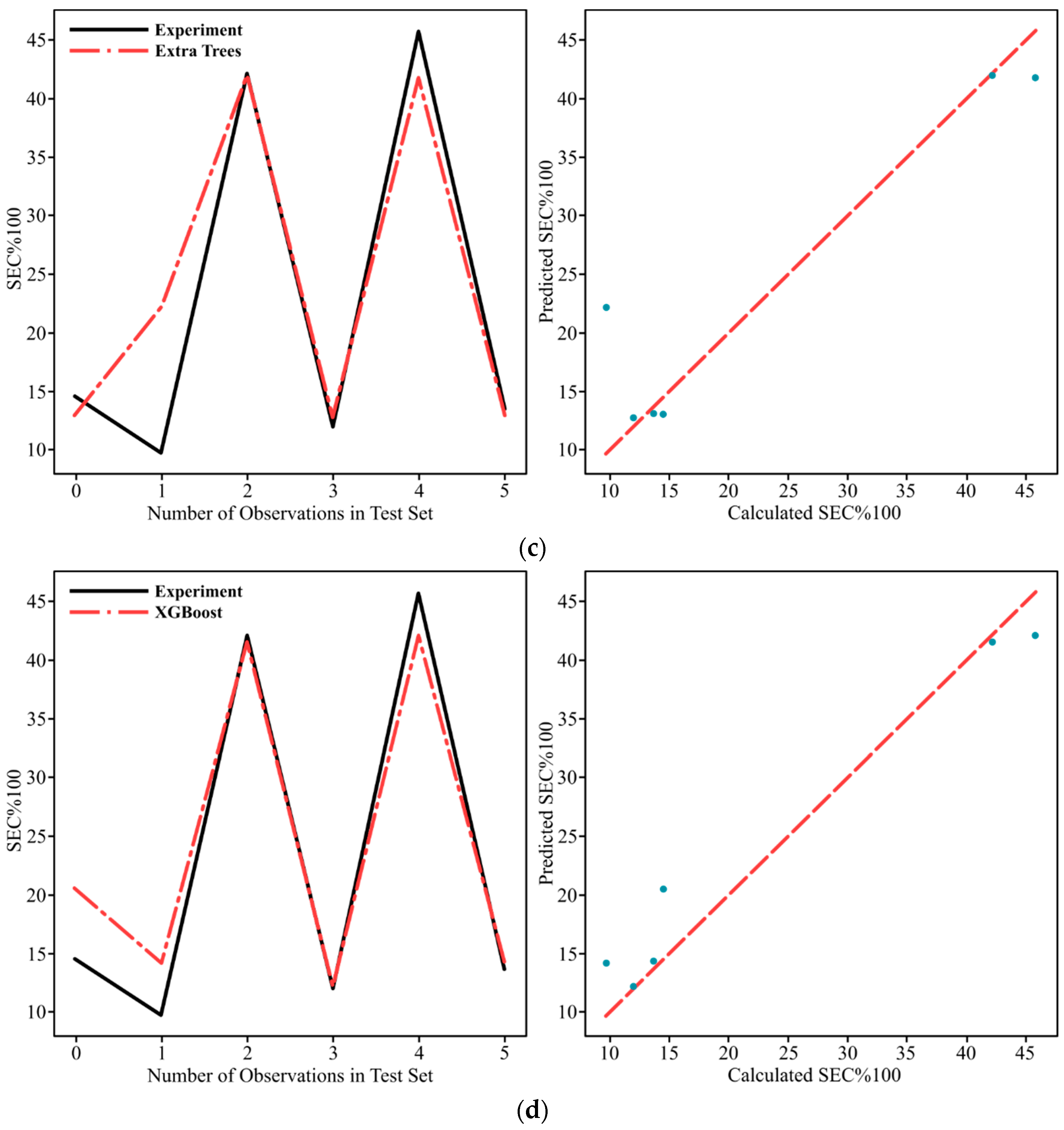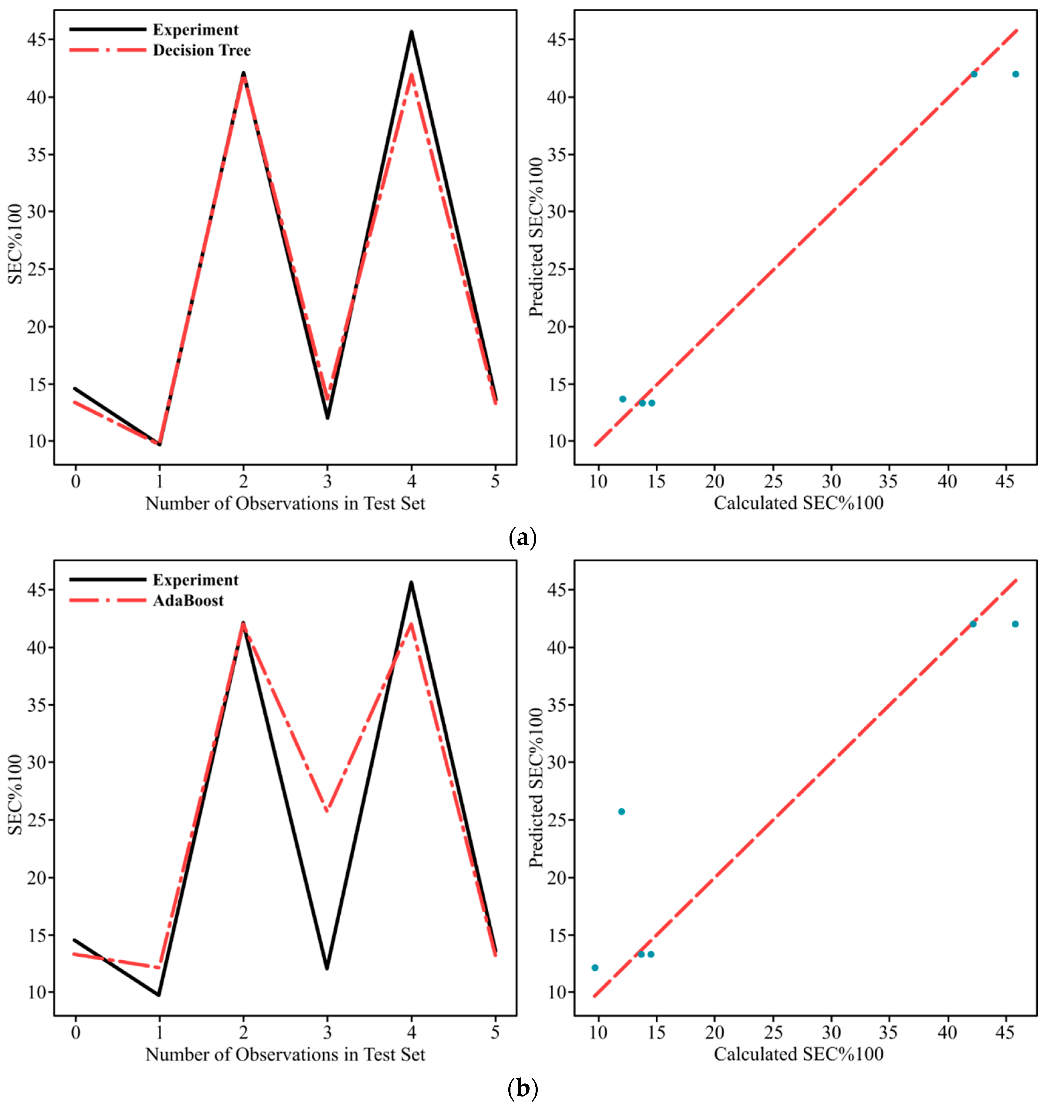 Figure 9 shows a comparison of the calculated and predicted SEC%100 using DT, AB, ET, and XGB algorithms. From
