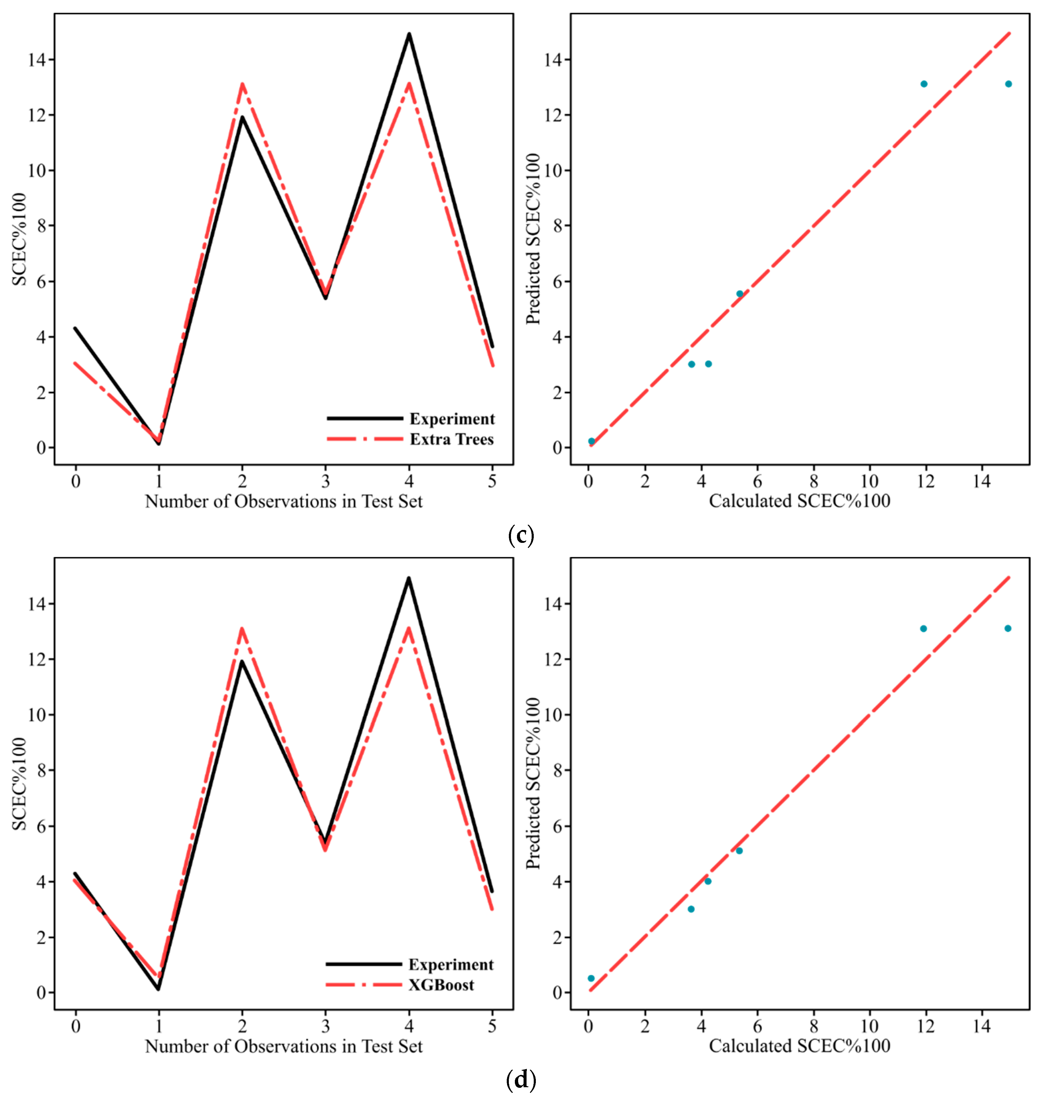 Figure 10 shows the comparison of calculated and predicted SCEC%100 using DT, AB, ET, and XGB algorithms. From