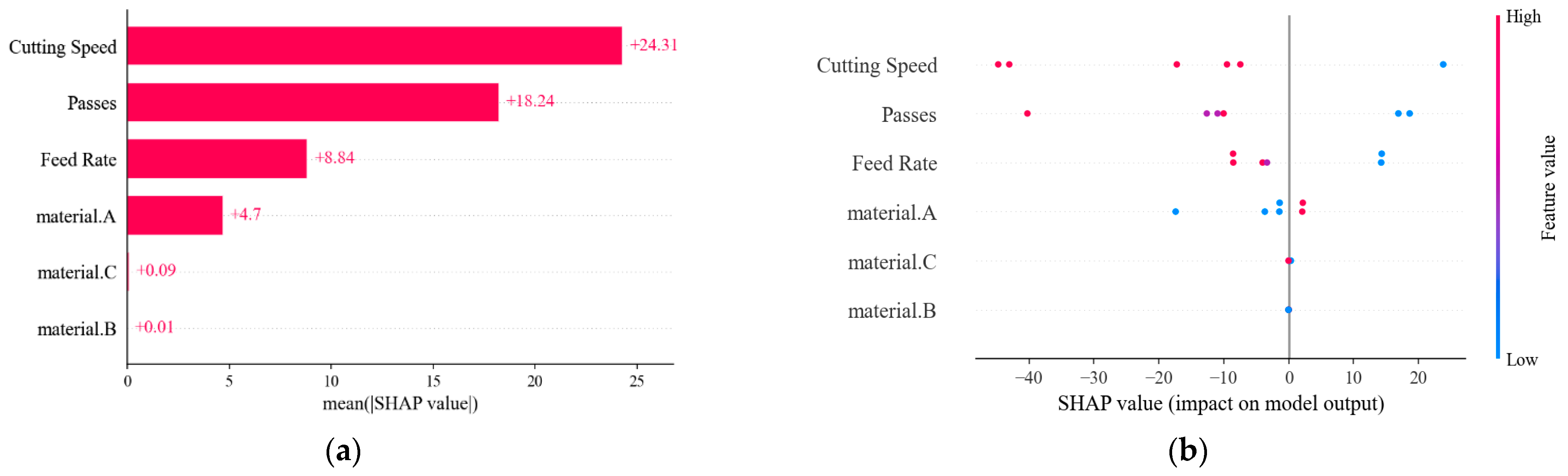 Figure 11a, it is seen that the most significant contributor to the DT model prediction is the “Cutting Speed” feature, with the mean absolute SHAP value of +24.3. This reflects the critical role of the cutting speed feature in the determination of the performance outcomes in the machining process. Additionally, the “Passes” feature demonstrates a remarkable mean SHAP value of +18.24, showing the second most contributing feature to the DT performance. Likewise, the “Feed Rate” feature of +8.84 presents a meaningful contribution to the predictive output. In contrast, material.A, material.B, and material.C features, material types labeled as categorical features, produce considerably lower absolute mean SHAP values of +4.7, +0.09, and +0.01, respectively. These lower values demonstrate their minimal contribution to the prediction accuracy of the DT model for SEC%100 output.