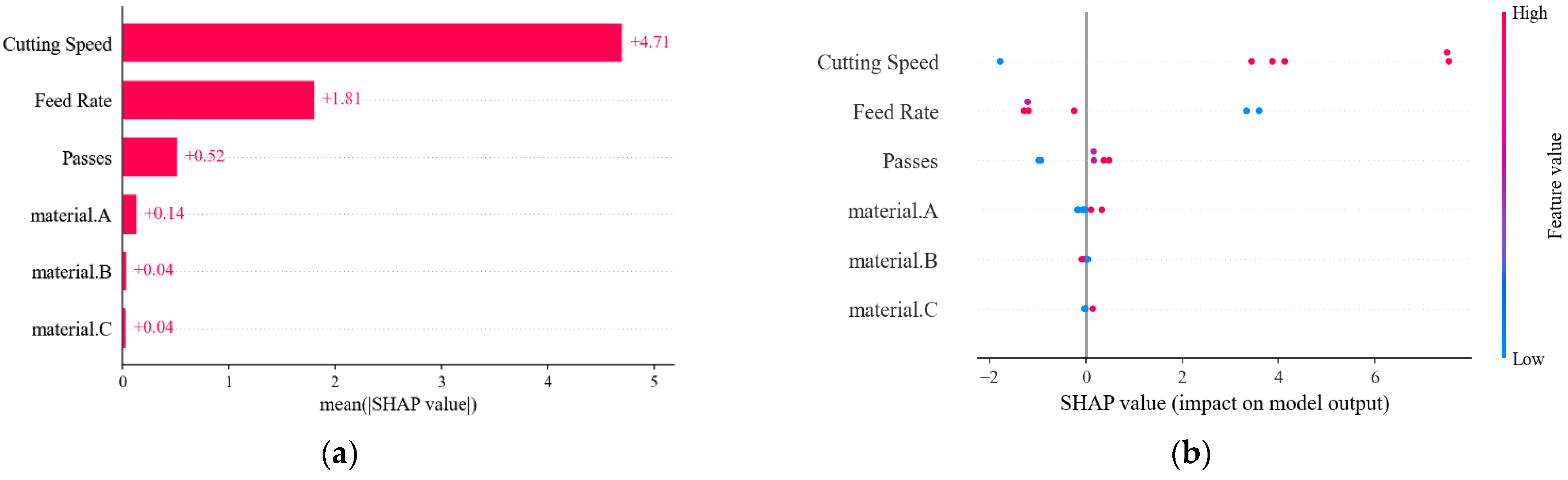 Figure 12a, the “Cutting Speed” feature is the predominant contributor to the model predictions, with the absolute mean SHAP value of +4.71. Similar to the DT model, this shows the importance of the “Cutting Speed” feature on the prediction performance and accuracy of the XGBoost model. In addition, the “Feed Rate” feature comes in second place with the absolute mean SHAP value of +1.82, and the “Passes” feature follows with the SHAP value of +0.81 by illustrating the measurable impact on the predicted outputs by the XGB model. Conversely, material.A, material.B, and material.C features exhibit significantly lower absolute mean SHAP values of +0.14, +0.04, and +0.04, respectively. This indicates that although material type and quality are relevant to the machining process, their impact on the prediction of SCEC%100 with the XGB model is far less important compared to machining parameters.