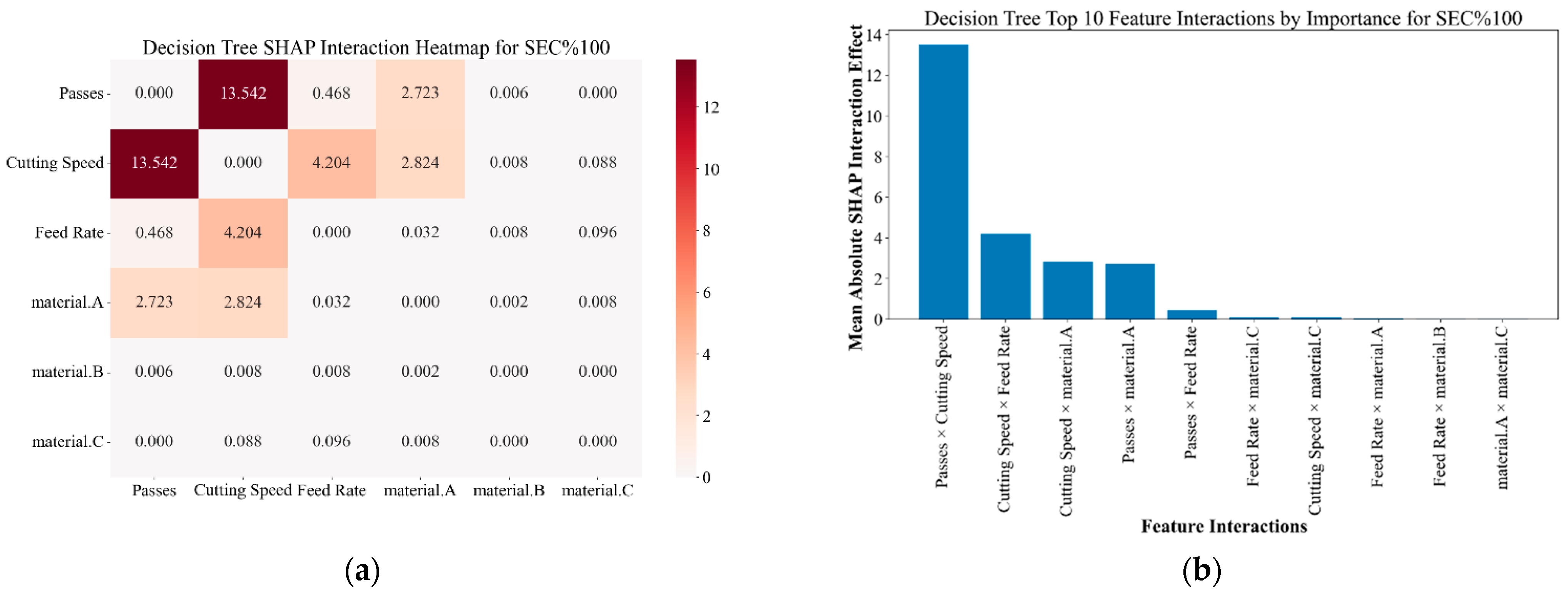 Figure 13, the strongest interaction was seen between passes and cutting speed features by the SHAP value of 13.542, presenting a robust synergistic feature interaction between these two machining operational parameters. This high feature interaction value demonstrates that the combined effect of passes and cutting speed on the prediction of SEC%100 using the DT model exceeds the individual contributions of those features. The interaction of cutting speed and feed rate features by the value of 4.204 represents the second most significant interaction, reflecting the established correlation and importance of machining operational parameters on the prediction of SEC%100 using the DT model. Additionally, in terms of the material property effect on the prediction of SEC%100, it is seen that the interactions of cutting speed-material.A and passes-material.A pair exhibited moderate feature interaction values of 2.824 and 2.723, respectively, while material.B and material.C features showed weak interactions. These values indicate the unique behavioral responses of material type A to machining operational parameters when compared to material types B and C. In addition, in terms of the evaluation of Fe content of 0.59% and Cu content of 0.59% for material type A, it can be deduced that this increased response to the machining operational parameters may be linked to the pure composition and low alloying properties, causing the more predictable and strong reactions to fluctuations in cutting speed and the number of passes. Regarding the composition of material types A, B, and C, it can be stated that feature interaction analysis of the DT model for SEC%100 prediction indicates an inverse relationship between interaction strength and alloying content, showing that higher iron concentration influences material response to machining parameters, likely due to improved work hardening and complex metallurgical interactions during cutting processes. The DT model primarily predicts the SEC%100 values through the passes–cutting speed relationship, with feed rate playing a second dominant interactive role. Then, the material composition significantly influences model behavior, with low-alloying materials exhibiting more predictable responses for SEC%100 compared to high-alloying materials because of microstructural differences. Furthermore, the symmetric nature of these feature interactions confirms the bidirectional interdependence between these parameters.