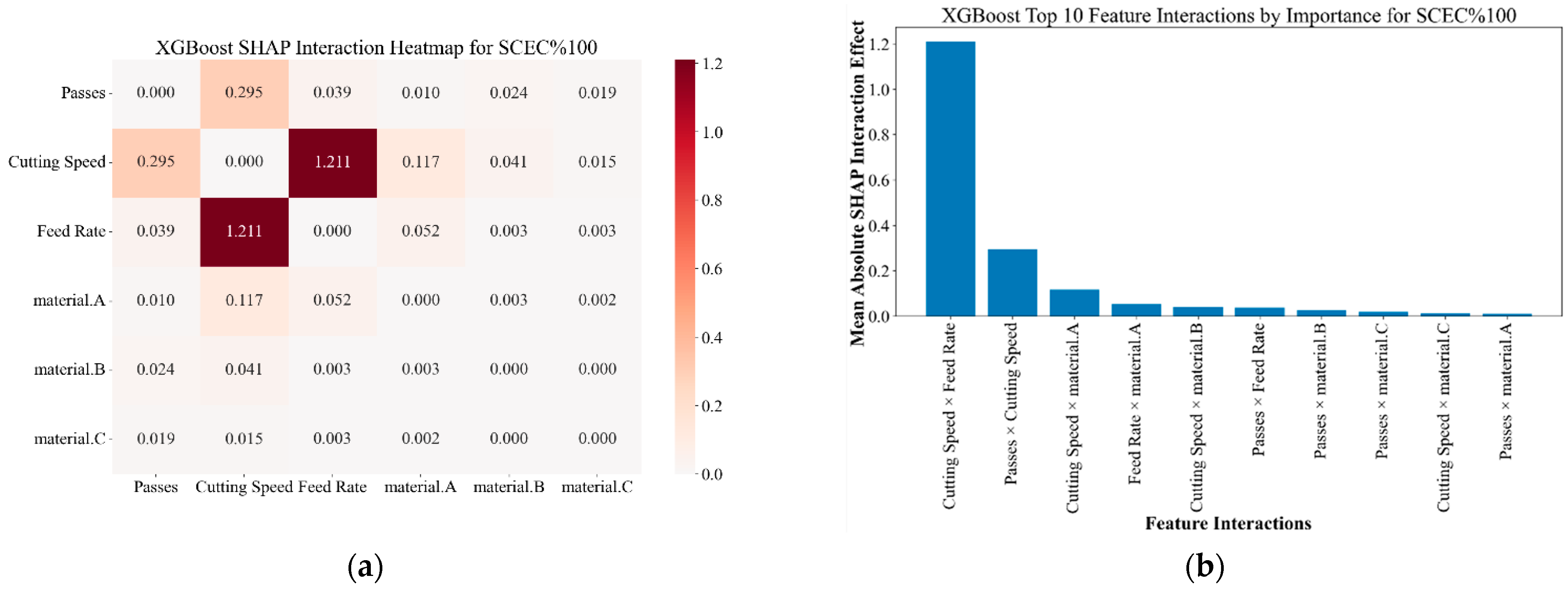 Figure 14, the most dominant feature interaction was seen between cutting speed and feed rate features, with the value of 1.211, while the cutting speed and passes feature interaction ranked in second place, with the value of 0.295. This highest interaction value exemplifies the conventional machining operational relationship in which cutting speed and feed rate collectively influence the material removal rate and chip formation as well. Likewise, the highest feature interaction of cutting speed and feed rate demonstrates that the combined effect of the feature interactions on the prediction of SCEC%100 using the XGB model overlaps the individual contributions of those features. The second-highest feature interaction value of 0.295 between cutting speed and passes also indicates the importance of the machining operational parameters in predicting SCEC%100 with the XGB model. Moreover, in terms of the material property effect on the prediction of SCEC%100, it is seen that moderate feature interaction values of 0.117 and 0.052 occur between cutting speed–material.A and feed rate–material.A feature pairs, respectively, while weak interactions occur between passes–material.B and passes–material.C feature pairs with values of 0.024 and 0.019, respectively. These moderate interaction values of material.A reflect the unique behavioral responses of material type A to machining operational parameters in contrast to material types B and C. Furthermore, considering the Fe content of 0.59% and the Cu content of 0.59% in material type A, the DT model exhibits comparable outcomes. The enhanced sensitivity to machining parameters may be attributed to the material’s relatively pure composition and low alloying degree, which promote more consistent and robust responses to variations in cutting speed and the number of passes. In terms of evaluation of the composition of material types A, B, and C, it can be remarked that feature interaction analysis of the XGB model for SCEC%100 prediction indicates an inverse relationship between interaction strength and alloying content similar to DT model performance by showing that a higher iron concentration influences the material response to machining parameters, likely due to improved work hardening and complex metallurgical interactions during cutting processes. In contrast to the DT model, the XGB model initially predicts the SCEC%100 values by taking into account the cutting speed–feed rate relationship, with passes playing a second dominant interactive role. Afterwards, the material composition significantly influences model behavior, with low-alloying materials showing more predictable responses for SCEC%100 compared to high-alloying materials due to microstructural differences. Moreover, the symmetric nature of these feature interactions validates the bidirectional interdependence between these parameters.