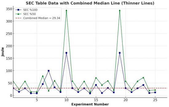 The analysis of SCEC values reveals that higher cutting speeds optimize energy consumption, whereas at lower feed rates, energy density tends to increase. Specifically, at a cutting speed of 150 m/s and a feed rate of 0.15 mm/s, the SCEC 100% and SCEC 50% values exhibit a more balanced distribution. These findings suggest that to enhance energy efficiency, a high cutting speed and a moderate feed rate should be preferred. When evaluating the impact of material type, the results indicate that energy consumption is directly related to the physical properties of the material. Among the tested materials, Material 2 demonstrated the lowest SEC and SCEC values, providing a significant advantage in terms of energy efficiency. In contrast, Materials 1 and 3 resulted in higher energy consumption, emphasizing the need for careful material selection to optimize machining efficiency.