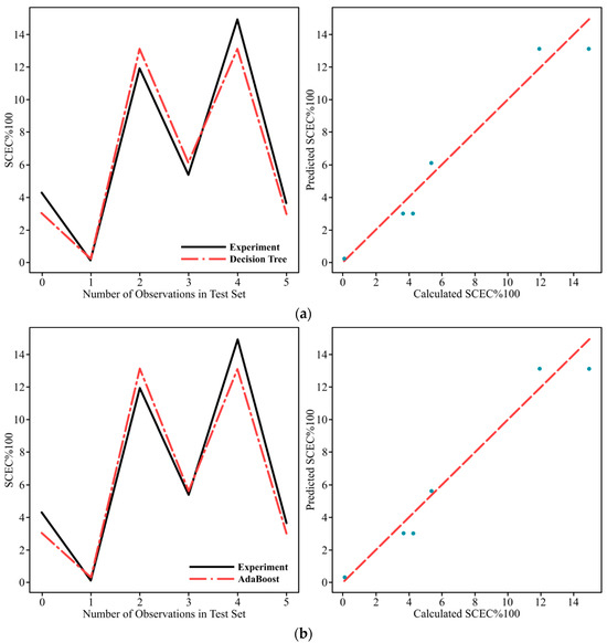 Table 6 compares the final prediction evaluation metric scores of DT, AB, ET, and XGB algorithms for SEC%100 and SCEC%100 outputs. Based on the comparison of metrics scores, it is seen that DT and XGB algorithms outperform the other algorithms in terms of R2 scores of 0.98634 and 0.96533 for SEC%100 and SCEC%100, respectively. The hyperparameters of the DT model were tuned as min_samples_split: 6, min_samples_leaf: 3, criterion: absolute_error, max_features: 2, min_impurity_decrease: 0.05, ccp_alpha: 0.1, while XGB model was n_estimators:10, learning_rate: 0.1, reg_alpha: 1.0, reg_lambda: 1.0, gamma: 0.5, subsample: 0.6, colsample_bytree: 0.5. DT and XGB algorithms can be more capable of reducing the error rate between predicted and original values and have more robust prediction accuracy than the other algorithms since both algorithms produce the highest R2 score and the lowest, RMSE, MAE, and MSE scores.
