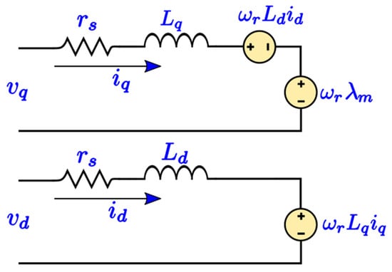 where denote the stator voltages, currents, and flux linkages in the dq-reference frame. The stator winding resistance is represented by . represents the electrical rotor angular speed and stands for the mechanical rotor angular speed. denotes the magnetic rotor flux linkage; p symbolizes the time differentiator, represents the electromagnetic torque and torque of the load; and b, P, and j are the viscous friction of the motor, the total poles numbers, and the inertia of the machine, respectively. In our model, we considered a round-rotor PMSM, where . The equivalent PMSM circuit might easily be signified as shown in Figure 1.