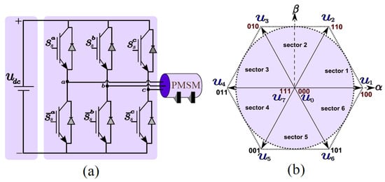 (a) A three-phase inverter provides power to a permanent magnet synchronous motor; (b) the space vector of three-phase two-level inverter [36].