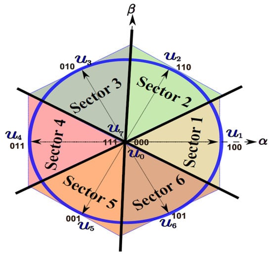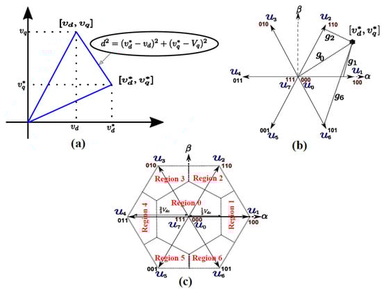 Figure 7a illustrates how this cost function depicts the distance between the reference voltage vector [] and each candidate voltage vector []. As a result, the cost is reduced, which is the same as reducing the separation between these two vectors (Figure 7b). Using this geometric interpretation, we may identify places in the αβ-plane where each voltage vector is nearest to the reference vector, as a result, the vector space is divided into regions as shown in Figure 7c.