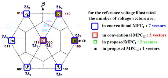 With this modification, the algorithm only has the option of selecting two voltage vectors (e.g., vectors 0 and 1) when the reference voltage vector is located within a certain sector, such sector 1. This simplifies the control strategy. The process is identical to that utilized by conventional MPCII. First, Equations (14) and (15) are used to determine the necessary inverter voltage. Equation (16) is then used to derive the reference voltages in the αβ reference frame (). Equation (17) is then used to calculate this voltage vector’s angle.