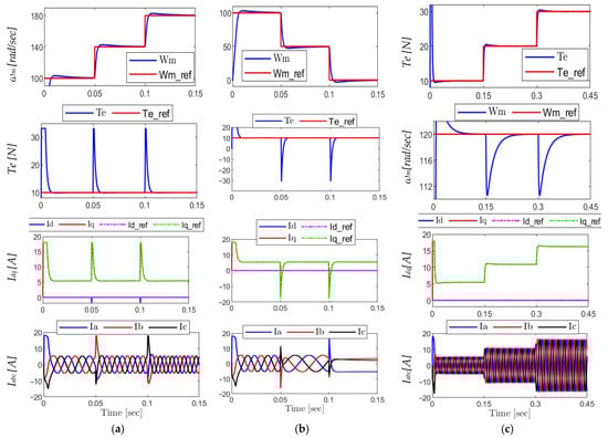 In order to evaluate the controllers’ performance, they are put through three distinct dynamic scenarios: a step-up in speed, a speed step-down to standstill, a torque variation at constant speed, and a comparison of the computational times for each.