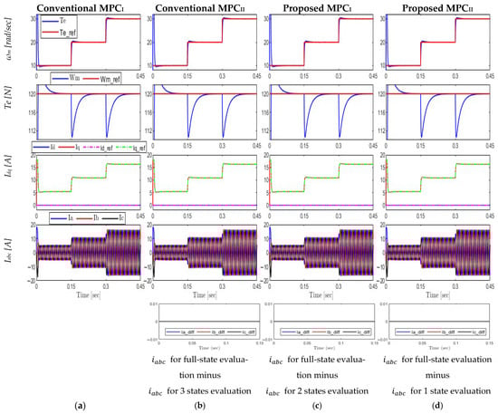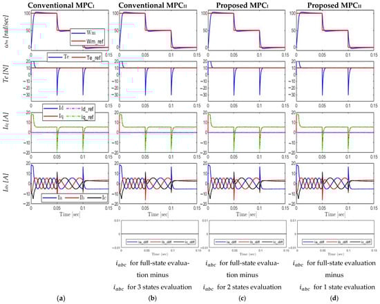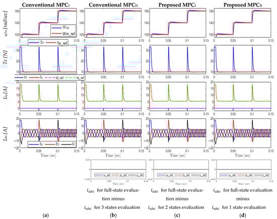 Comparative analysis between all approaches under torque variation at constant speed: (a) conventional MPCI; (b) conventional MPCII; (c) proposed MPCI; (d) proposed MPCII.