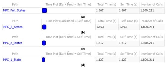 Comparative analysis between all approach computational times: (a) conventional MPCI; (b) conventional MPCII; (c) proposed MPCI; (d) proposed MPCII.