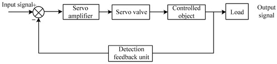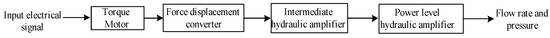 As shown in Figure 2, the signal flow block diagram is a commonly used model in hydraulic systems. The force-feedback type two-stage electro-hydraulic servo valve is composed of components such as a torque motor, a displacement-force displacement conversion device, and various amplifiers. First, the electrical signal is used as an input signal, which can be output as a torque data signal after passing through the torque motor, and then the signal is converted into movement data through the displacement conversion device. In this way, the displacement signal can drive the valve core to move through the hydraulic amplifier, and the power stage amplifier circuit can output flow and voltage to drive the load movement [20,21].