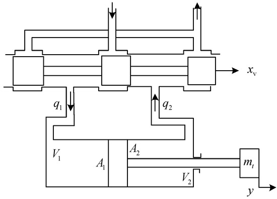 The right movement of the valve core is set to be in a positive direction. When the valve core moves to the right, that is, when the displacement xv of the valve core is greater than 0, the linearized flow continuity equation, load flow equation, and force balance equation can be obtained [29,30]