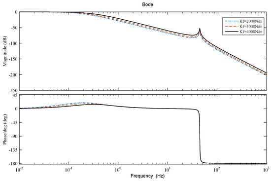 This section focuses on servo valves and explores their working characteristics under vibration and impact conditions due to the sensitivity of the linear displacement of the slide valve armature to frequency changes in the low frequency range (<100 Hz). As shown in Figure 6, the frequency spectrum is based on different values of spring tube stiffness. When the vibration frequency is higher than 45 Hz, gain of amplitude frequency is large, which is prone to resonance problems. The influence of mass on load displacement is minimal, while an increase in load pressure and spring tube stiffness will enhance frequency characteristics and resonance. The applicable frequency range is within the resonant frequency range, which seriously interferes with the stability of the servo valve. Therefore, it must be taken seriously, and efforts must be made to prevent the operation of electro-hydraulic servo valves under such oscillation conditions.