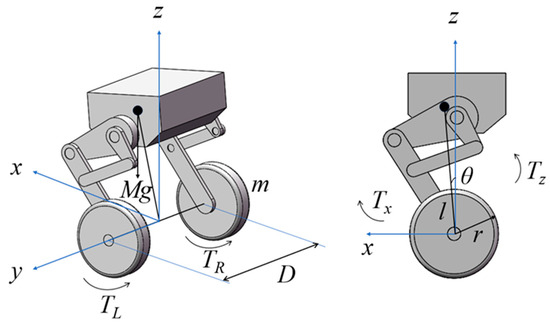- For the wheeled motion of the wheeled bipedal robot, it is equivalently simplified to a wheeled inverted pendulum model with a variable pendulum length. A dynamic model is constructed to derive the system’s state-space model, with the balanced posture defined.