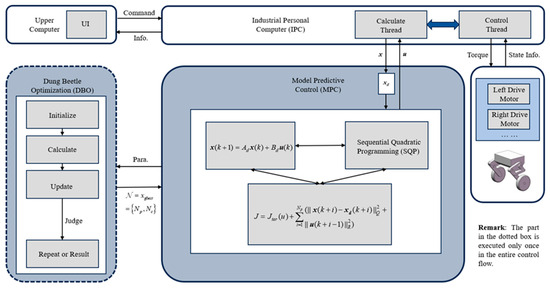 As discussed in Section 2, under wheeled motion, the WBR can be equivalently simplified to a wheeled inverted pendulum system. The wheeled inverted pendulum system is highly unstable. Without a control algorithm, the system will gradually diverge over time, making it difficult to restore balance. Therefore, a proper control algorithm is required to ensure the system’s controllability and allow it to converge over time, maintaining a balanced posture. MPC is widely used in the industrial field, and in the past decade, extensive research has been conducted on MPC’s technical selection, variable control, and performance estimation [30]. Therefore, this paper adopts MPC as the balance control algorithm for the WBR and optimizes the horizon parameters of the MPC with anti-disturbance as the control objective. The control algorithm proposed in this paper, along with the control framework applied to the robot, is shown in Figure 3.