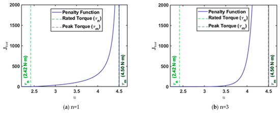 As for the nonlinear acceleration factor , its magnitude determines the degree of nonlinearity of the penalty function. For the hub motor of the WBR, it is necessary to provide short-term torque that exceeds the rated torque. To allow for short-term overload, the ideal range for should be between . Based on the above definitions, the following nonlinear penalty function is designed: