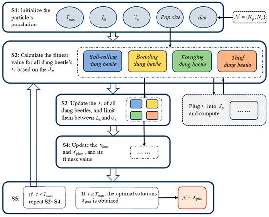 By setting the initial values for feasible solutions and specifying the population size and number of iterations, the cost function can be iteratively optimized according to Equation (26). The main optimization process is shown in Figure 5.