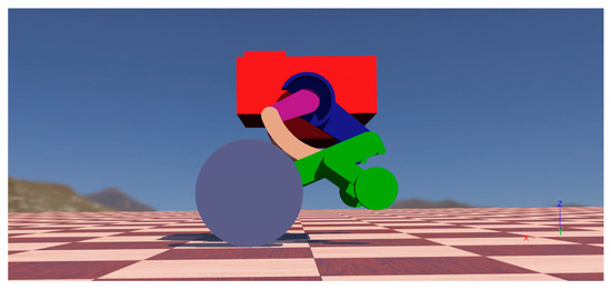 where represents the x-axis coordinate of the robot’s overall center of mass, denotes the x-axis coordinates of the centers of mass for individual parts such as the upper leg and lower leg links, and represents the masses of the robot’s components. The robot maintains a balanced state when the projection of its center of mass in the x-z plane coincides with the center of the drive wheels. The robot’s posture at this time is shown in Figure 2.