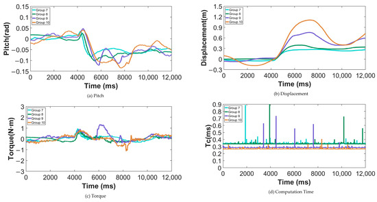 The results of the four load disturbance experiments show that MPC optimized with DBO (Group 7) outperforms the other three groups in terms of both the first overshoot and adjustment time of the pitch angle, demonstrating stronger posture recovery capability. The displacement index remains at a normal level, while the torque exhibits certain overshoot despite having a relatively better adjustment time, with computation time being slightly higher. Overall, the remarkable advantage of DBO-optimized MPC in pitch angle control stems from its subpopulation parallel search and global–local balance mechanism, which enable parameter configurations to better reconcile prediction accuracy and control stability, thereby effectively suppressing posture deviations caused by load disturbances. In contrast, the displacement and torque indicators show relatively neutral performance, reflecting that under complex coupled disturbances, the optimization mainly concentrates its performance gains on the posture dimension to ensure overall balance and safety of the robot when subjected to vertical loads.