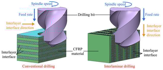 Carbon fiber reinforced composites (CFRPs) have significant application advantages in industrial fields such as wind power generation, aerospace, and military defense due to their high specific strength to stiffness, corrosion resistance, and fatigue resistance [1,2]. With the continuous expansion of the application scope of CFRPs, the requirements of hole-making are also constantly updated. CFRP interlaminar drilling is a new method that differs from traditional CFRP drilling. Its characteristic is that the tool feed direction is parallel to the direction of the material interlaminar interface, which is significantly different from the direction perpendicular to the interlaminar interface in traditional drilling, as shown in Figure 1. At present, there is a clear demand for CFRP interlaminar drilling, such as the joint connections of robot limbs, the end faces of new energy vehicle battery boxes, and the bolt holes at the roots of wind turbine blades [3]. However, previous studies have shown that the interlaminar drilling of CFRPs is also prone to producing some damage at the outlet compared to the conventional drilling method of CFRPs, such as burrs, delamination, and tears. Moreover, the risk of damage caused by interlaminar drilling is more prominent [4,5,6]. Therefore, effectively controlling the damage during the interlaminar drilling is crucial to ensure the reliable service of CFRP interlaminar drilling components.