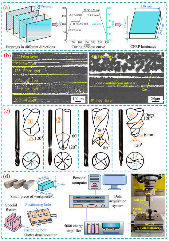Experimental process: (a) CFRP curing; (b) the cross-sectional morphology of the workpiece; (c) different structural tools; (d) test scene.