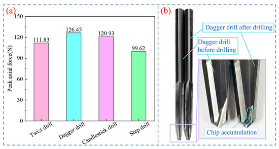 Analysis of the peak axial force in interlaminar drilling of CFRPs using different drill bits (n = 2000 r/min, f = 0.06 mm/r): (a) the peak axial force, (b) comparison of dagger drills before and after processing.