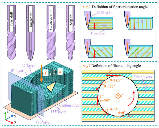 The anticlockwise included angle between the tool feed direction and the fiber orientation is defined as the fiber orientation angle (FOA, γ), and the anticlockwise included angle between the tool cutting direction and the projection of the fiber direction on the outlet surface is defined as the fiber cutting angle (FCA, θ). Due to the layering order of the materials used in this study being 90°/45°/0°/−45°, when conducting the interlaminar drilling of CFRP, the fiber layers can be denoted as γ = 0°, γ = 90°, γ = 45°, and γ = 135°, as shown in Figure 5.