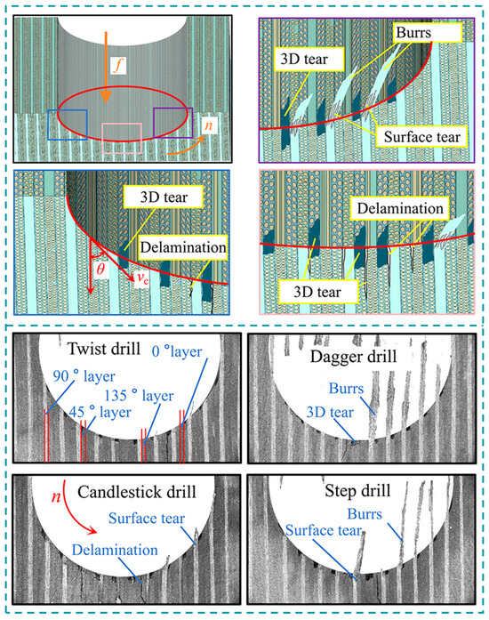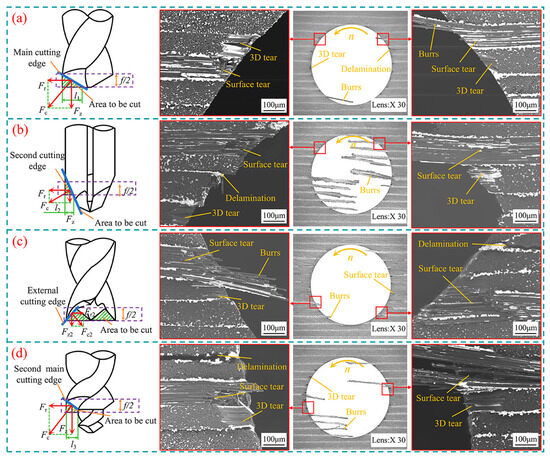Due to the sharp outer corner of the candlestick drill, it can cut off the outlet material in a timely manner. Therefore, there are fewer burrs at the outlet, and a more complete machining surface can be formed, as shown in Figure 6c. When the outer edge corner and the point angle of the drill core are simultaneously drilled into the material, the axial force is composed of a combination of central concentrated load and circumferential distributed load. For the 45° and 135° fiber layers, due to the dispersing effect of the inner and outer cutting edges on the total axial force of drilling, as well as the radial force Fr2 of the outer cutting edge on the uncut material in the hole, the local axial force on the uncut material around the outlet hole is difficult to reach the critical axial force for forming 3D tear damage [21]. Thus, the formation of 3D tear damage can be avoided. But within the 90° fiber layer, the axial force Fz2 provided by the outer edge angle of the drill bit acts on the edge of the hole. As the drill bit feeds axially, the surface material at the outlet arises out-of-plane bending and yielding under the axial force Fz2. When Fz2 exceeds the strength of the fiber/resin interface, the interface may crack and expand along the fiber direction. The fibers that undergo out-of-plane bending will undergo in-plane radial bending under the sharp outer edge corner and the tangential pushing effect of the outer cutting edge. Due to the brittle nature of carbon fiber, uncut burrs are prone to bending, fracture, and detachment from the material. Ultimately, extensive surface tearing damage around the hole is formed.