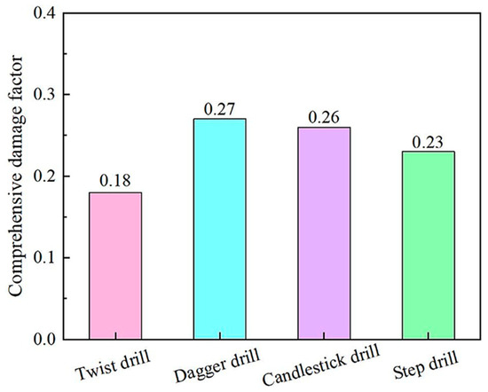 The comprehensive evaluation of the outlet damage morphology generated by different cutting tools under the same machining condition is shown in Figure 7. As can be seen, the comprehensive damage factors produced by the dagger drill, candlestick drill, step drill, and twist drill decrease in turn, which are 0.27, 0.26, 0.23, and 0.18, respectively. Combined with the outlet surface morphologies in Figure 6, it is found that the damage type produced by the dagger drill is mainly the burr damage, the large area of surface tear damage on the outlet is mainly formed by the candlestick drill, and the step drill and twist drill both produce obvious 3D tear damage around the hole. In addition, due to the different fiber direction angles formed between the fibers in the fiber layer and the feed direction, there are significant differences in the types of damage to the outlet material.