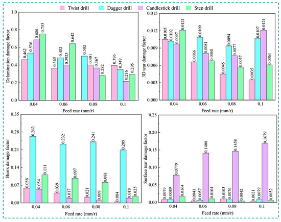 Figure 9 shows the influence of tool structure on the single outlet damage factor of CFRP interlaminar drilling under different feed rates at the spindle speed of 4000 r/min. Among them, surface tear damage and outlet burr damage are greatly affected by the tool structures. Taking the feed rate of 0.06 mm/r as an example, when using a twist drill, dagger drill, candlestick drill, and step drill for interlaminar drilling of CFRPs, the burr damage factors are 0.039, 0.232, 0.017, and 0.097, respectively, and the surface tear damage factors are 0.0041, 0.0057, 0.1408, and 0.0104, respectively. Moreover, serious burr damage is easy to occur when using a dagger drill, and the outlet surface tear damage factor is the largest when using a candlestick drill. The 3D tear damage and exit delamination damage are not significantly affected by the tool structure, but regardless of the type of tool structure used, both types of damage exist on the outlet surface. In addition, the inhibition of twist drill on 3D tear damage is not obvious when drilling with the small feed rate. However, with the increase in feed rate, compared with the other three types of drill bits, the twist drill can form smaller 3D tear damage. Therefore, comprehensively considering the damage types of CFRP interlaminar drilling and its impact on machining quality, the twist drill has the smallest comprehensive damage and can effectively inhibit the 3D tear damage when the feed rate increases, which is more suitable for CFRP interlaminar drilling.